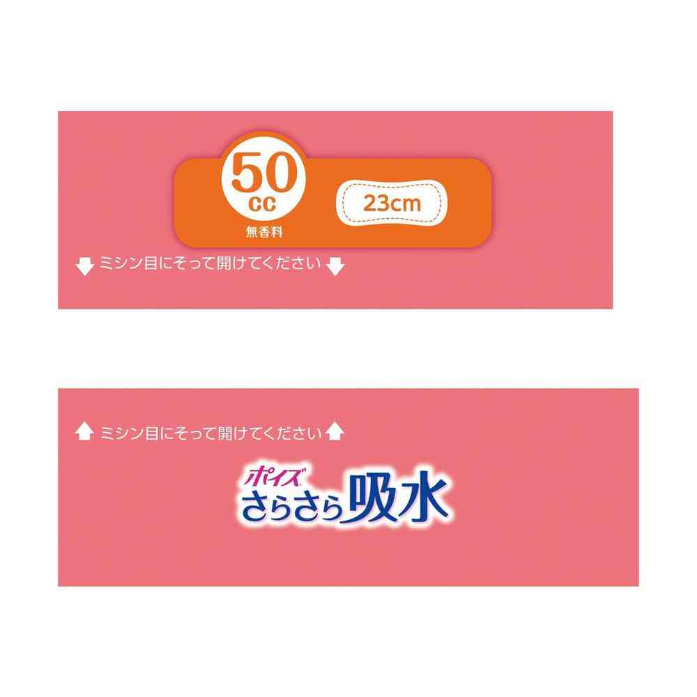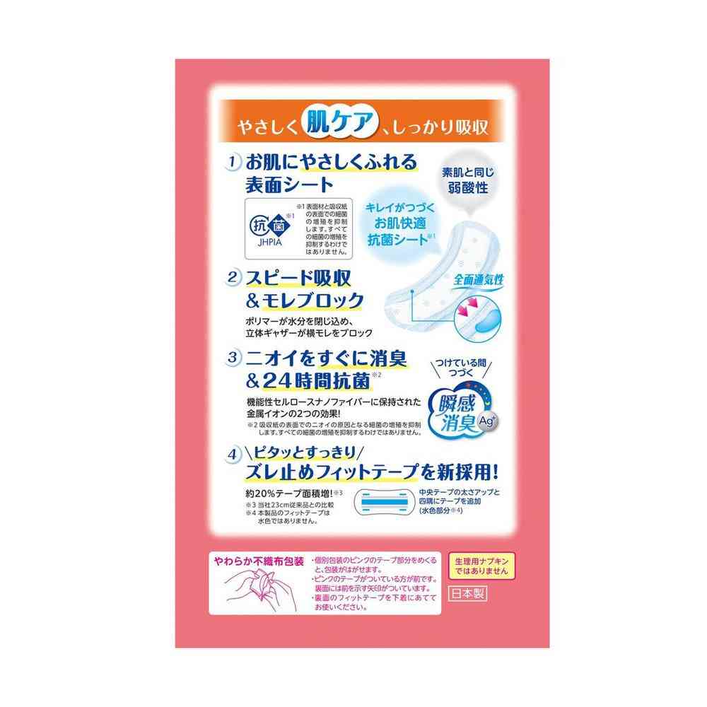 ・ピタッとすっきりズレ止めフィットテープを新採用 ・キレイがつづくお肌快適抗菌シートで肌トラブルを軽減 ・素肌と同じ弱酸性 ・スピード吸収&モレブロック ・ニオイをすぐに消臭&24時間抗菌 ・ムレにくい全面通気性 ・かわいい花柄エンボス ・無香料 ・吸収量の目安:50cc ・パッドサイズ:長さ23cm