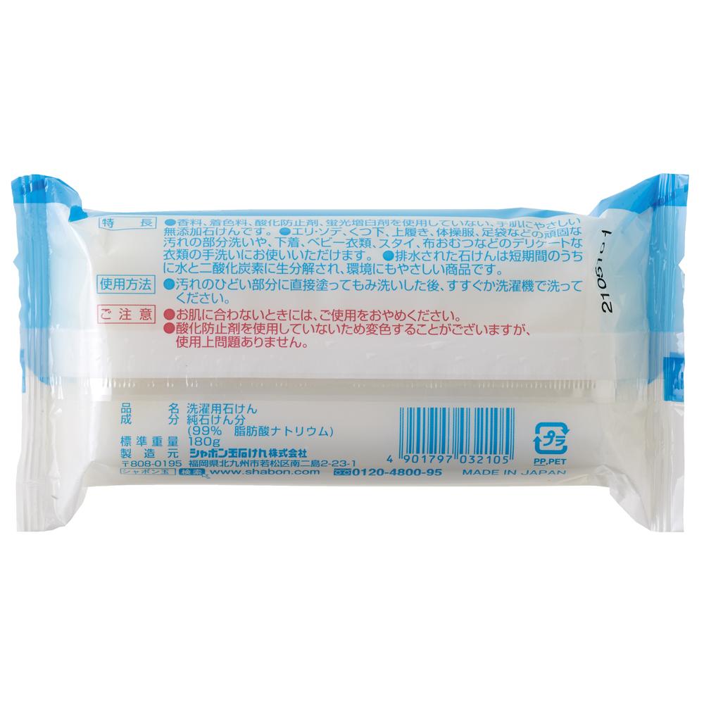●蛍光増白剤・香料・着色料・酸化防止剤・LASなどの合成界面活性剤を使用していない、手肌にやさしい無添加石けんです。 ●エリ・ソデやくつ下などの頑固な汚れや、下着やベビー衣類・スタイ、布おむつなどのデリケートな衣類の手洗いにおススメです。 ●汚れに直接塗ってもみ洗いした後、すすぐか洗濯機で洗うだけで頑固な汚れもスッキリきれいに。 ●天然油脂を釜炊き製法(ケン化法)で熟練の石けん職人がじっくり1週間以上かけて炊き上げた石けんです。 ●排水された石けんは短期間のうちに分解される、環境にやさしい無添加石けんです。 ●皮膚アレルギーテスト済み/皮膚刺激テスト済み(全ての方にアレルギーや刺激が起こらないということではありません)