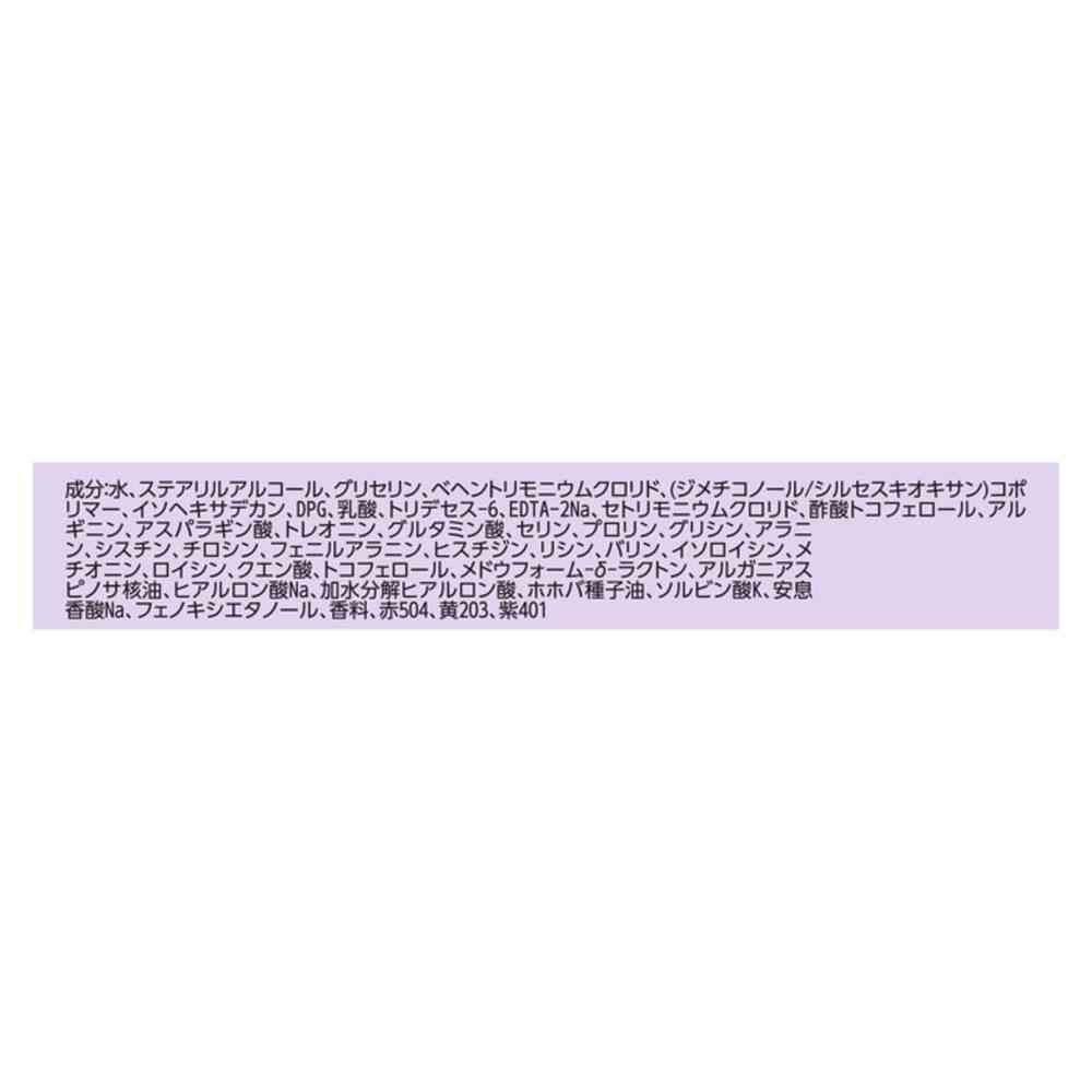 水、ステアリルアルコール、グリセリン、ベヘントリモニウムクロリド、(ジメチコノール/シルセスキオキサン)コポリマー、イソヘキサデカン、DPG、乳酸、トリデセス-6、EDTA-2Na、セトリモニウムクロリド、酢酸トコフェロール、アルギニン、アスパラギン酸、トレオニン、グルタミン酸、セリン、プロリン、グリシン、アラニン、シスチン、チロシン、フェニルアラニン、ヒスチジン、リシン、バリン、イソロイシン、メチオニン、ロイシン、クエン酸、トコフェロール、メドウフォーム-δ-ラクトン、アルガニアスピノサ核油、ヒアルロン酸Na、加水分解ヒアルロン酸、ホホバ種子油、ソルビン酸K、安息香酸Na、フェノキシエタノール、香料、赤504、黄203、紫401
