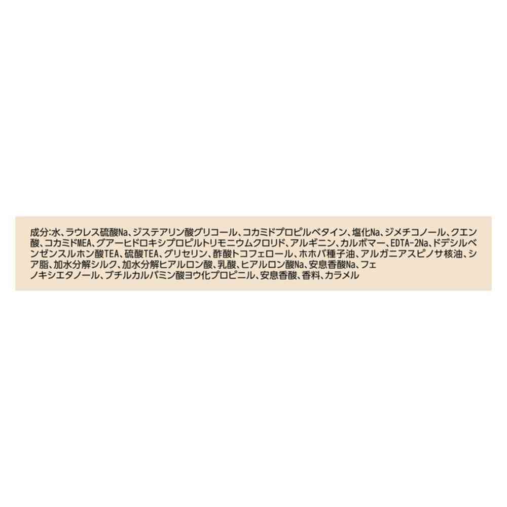 水、ラウレス硫酸Na、ジステアリン酸グリコール、コカミドプロピルベタイン、塩化Na、ジメチコノール、クエン酸、コカミドMEA、グアーヒドロキシプロピルトリモニウムクロリド、アルギニン、カルボマー、EDTA-2Na、ドデシルベンゼンスルホン酸TEA、硫酸TEA、グリセリン、酢酸トコフェロール、ホホバ種子油、アルガニアスピノサ核油、シア脂、加水分解シルク、加水分解ヒアルロン酸、乳酸、ヒアルロン酸Na、安息香酸Na、フェノキシエタノール、ブチルカルバミン酸ヨウ化プロピニル、安息香酸、香料、カラメル