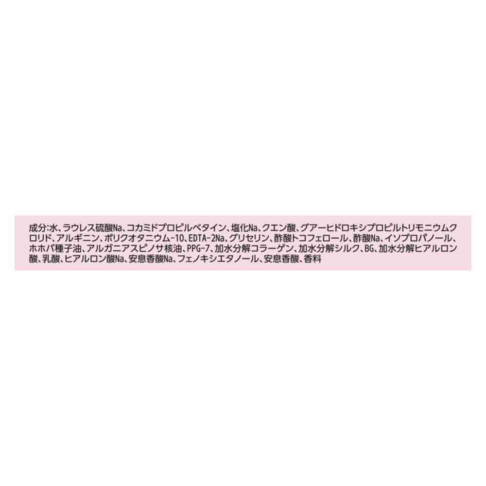 水、ラウレス硫酸Na、コカミドプロピルベタイン、塩化Na、クエン酸、グアーヒドロキシプロピルトリモニウムクロリド、アルギニン、ポリクオタニウム-10、EDTA-2Na、グリセリン、酢酸トコフェロール、酢酸Na、イソプロパノール、ホホバ種子油、アルガニアスピノサ核油、PPG-7、加水分解コラーゲン、加水分解シルク、BG、加水分解ヒアルロン酸、乳酸、ヒアルロン酸Na、安息香酸Na、フェノキシエタノール、安息香酸、香料
