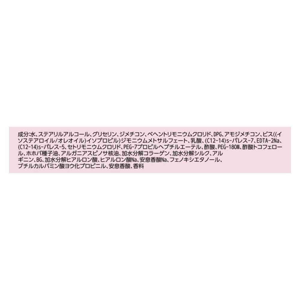 水、ステアリルアルコール、グリセリン、ジメチコン、ベヘントリモニウムクロリド、DPG、アモジメチコン、ビス((イソステアロイル/オレオイル)イソプロピル)ジモニウムメトサルフェート、乳酸、(C12-14)s-パレス-7、EDTA-2Na、(C12-14)s-パレス-5、セトリモニウムクロリド、PEG-7プロピルヘプチルエーテル、酢酸、PEG-180M、酢酸トコフェロール、ホホバ種子油、アルガニアスピノサ核油、加水分解コラーゲン、加水分解シルク、アルギニン、BG、加水分解ヒアルロン酸、ヒアルロン酸Na、安息香酸Na、フェノキシエタノール、ブチルカルバミン酸ヨウ化プロピニル、安息香酸、香料