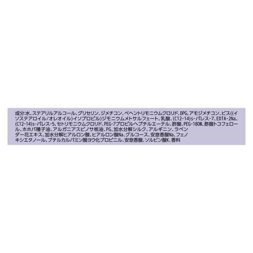 水、ステアリルアルコール、グリセリン、ジメチコン、ベヘントリモニウムクロリド、DPG、アモジメチコン、ビス((イソステアロイル/オレオイル)イソプロピル)ジモニウムメトサルフェート、乳酸、(C12-14)s-パレス-7、EDTA-2Na、(C12-14)s-パレス-5、セトリモニウムクロリド、PEG-7プロピルヘプチルエーテル、酢酸、PEG-180M、酢酸トコフェロール、ホホバ種子油、アルガニアスピノサ核油、PG、加水分解シルク、アルギニン、ラベンダー花エキス、加水分解ヒアルロン酸、ヒアルロン酸Na、グルコース、安息香酸Na、フェノキシエタノール、ブチルカルバミン酸ヨウ化プロピニル、安息香酸、ソルビン酸K、香料