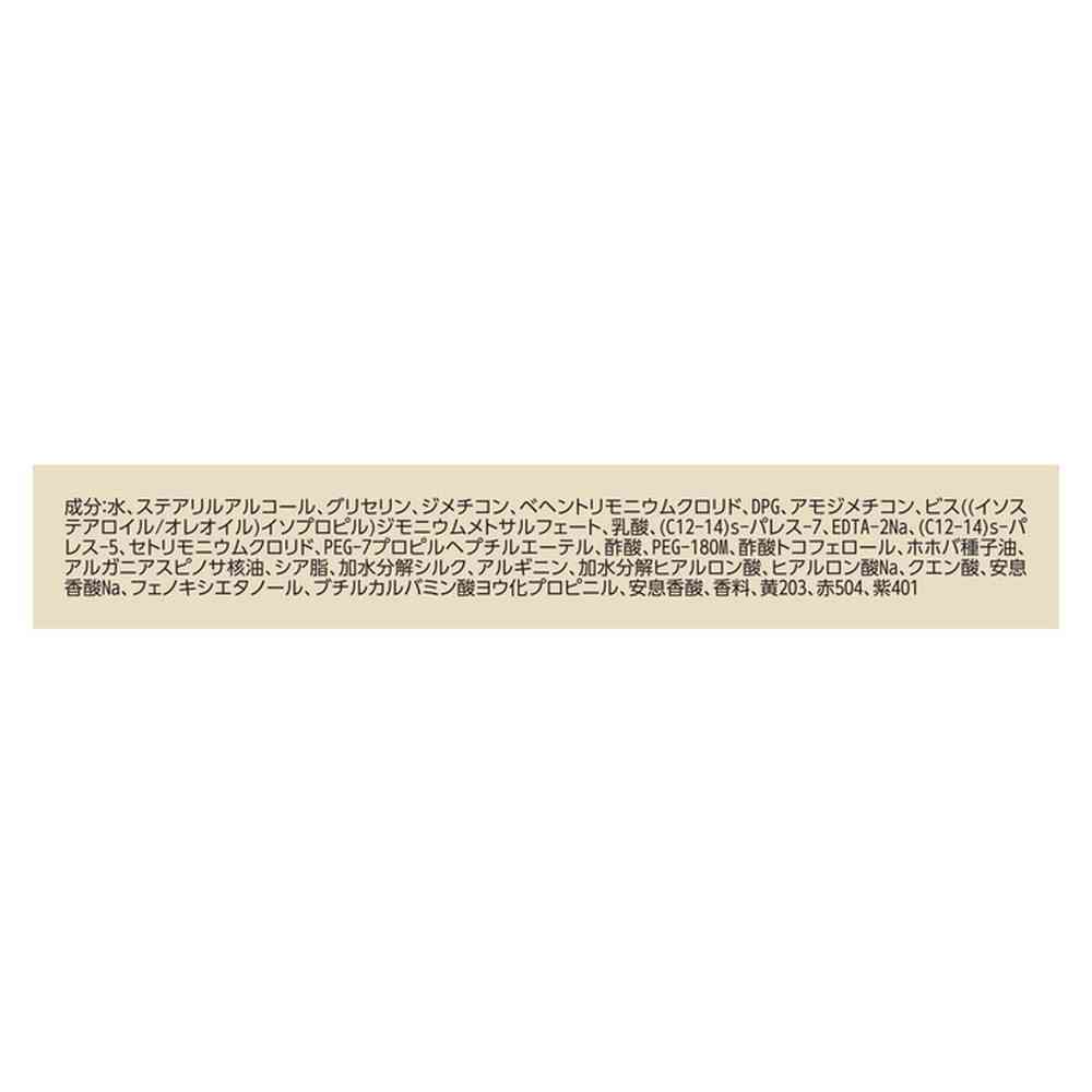 水、ステアリルアルコール、グリセリン、ジメチコン、ベヘントリモニウムクロリド、DPG、アモジメチコン、ビス((イソステアロイル/オレオイル)イソプロピル)ジモニウムメトサルフェート、乳酸、(C12-14)s-パレス-7、EDTA-2Na、(C12-14)s-パレス-5、セトリモニウムクロリド、PEG-7プロピルヘプチルエーテル、酢酸、PEG-180M、酢酸トコフェロール、ホホバ種子油、アルガニアスピノサ核油、シア脂、加水分解シルク、アルギニン、加水分解ヒアルロン酸、ヒアルロン酸Na、クエン酸、安息香酸Na、フェノキシエタノール、ブチルカルバミン酸ヨウ化プロピニル、安息香酸、香料、黄203、赤504、紫401