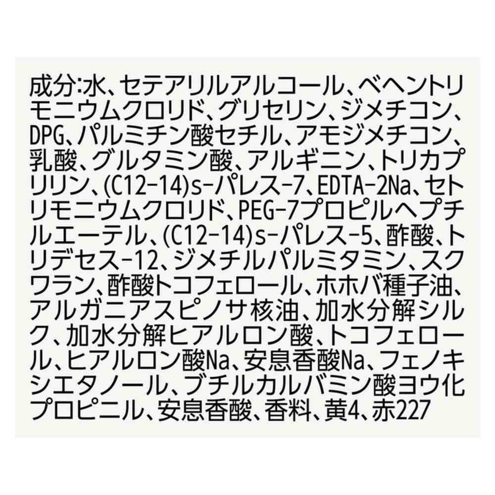 水、セテアリルアルコール、ベヘントリモニウムクロリド、グリセリン、ジメチコン、DPG、パルミチン酸セチル、アモジメチコン、乳酸、グルタミン酸、アルギニン、トリカプリリン、(C12-14)s-パレス-7、EDTA-2Na、セトリモニウムクロリド、PEG-7プロピルヘプチルエーテル、(C12-14)s-パレス-5、酢酸、トリデセス-12、ジメチルパルミタミン、スクワラン、酢酸トコフェロール、ホホバ種子油、アルガニアスピノサ核油、加水分解シルク、加水分解ヒアルロン酸、トコフェロール、ヒアルロン酸Na、安息香酸Na、フェノキシエタノール、ブチルカルバミン酸ヨウ化プロピニル、安息香酸、香料、黄4、赤227