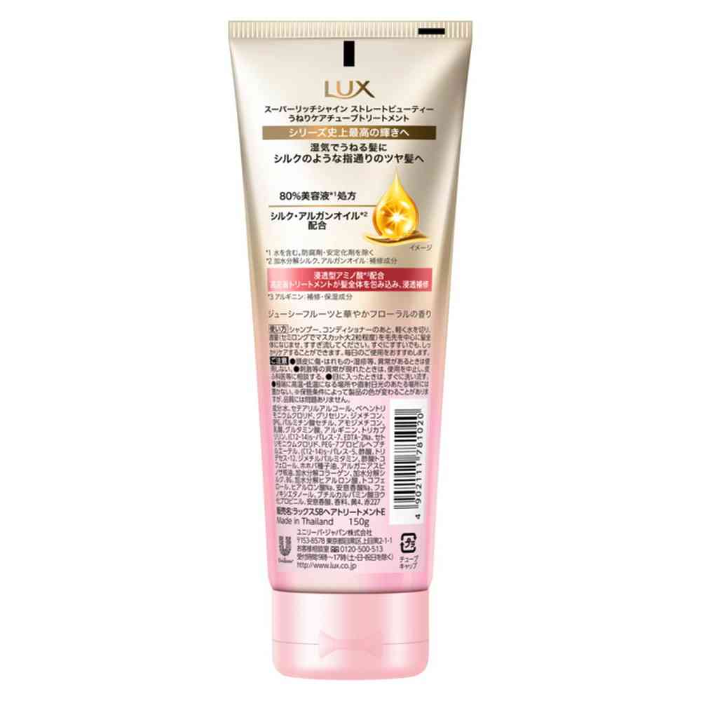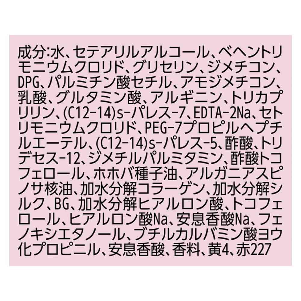 水、セテアリルアルコール、ベヘントリモニウムクロリド、グリセリン、ジメチコン、DPG、パルミチン酸セチル、アモジメチコン、乳酸、グルタミン酸、アルギニン、トリカプリリン、(C12-14)s-パレス-7、EDTA-2Na、セトリモニウムクロリド、PEG-7プロピルヘプチルエーテル、(C12-14)s-パレス-5、酢酸、トリデセス-12、ジメチルパルミタミン、酢酸トコフェロール、ホホバ種子油、アルガニアスピノサ核油、加水分解コラーゲン、加水分解シルク、BG、加水分解ヒアルロン酸、トコフェロール、ヒアルロン酸Na、安息香酸Na、フェノキシエタノール、ブチルカルバミン酸ヨウ化プロピニル、安息香酸、香料、黄4、赤227