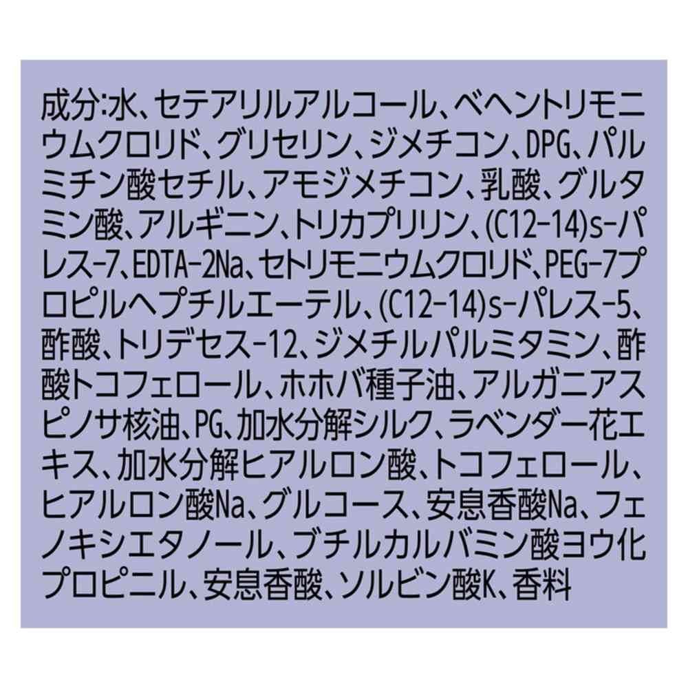 水、セテアリルアルコール、ベヘントリモニウムクロリド、グリセリン、ジメチコン、DPG、パルミチン酸セチル、アモジメチコン、乳酸、グルタミン酸、アルギニン、トリカプリリン、(C12-14)s-パレス-7、EDTA-2Na、セトリモニウムクロリド、PEG-7プロピルヘプチルエーテル、(C12-14)s-パレス-5、酢酸、トリデセス-12、ジメチルパルミタミン、酢酸トコフェロール、ホホバ種子油、アルガニアスピノサ核油、PG、加水分解シルク、ラベンダー花エキス、加水分解ヒアルロン酸、トコフェロール、ヒアルロン酸Na、グルコース、安息香酸Na、フェノキシエタノール、ブチルカルバミン酸ヨウ化プロピニル、安息香酸、ソルビン酸K、香料