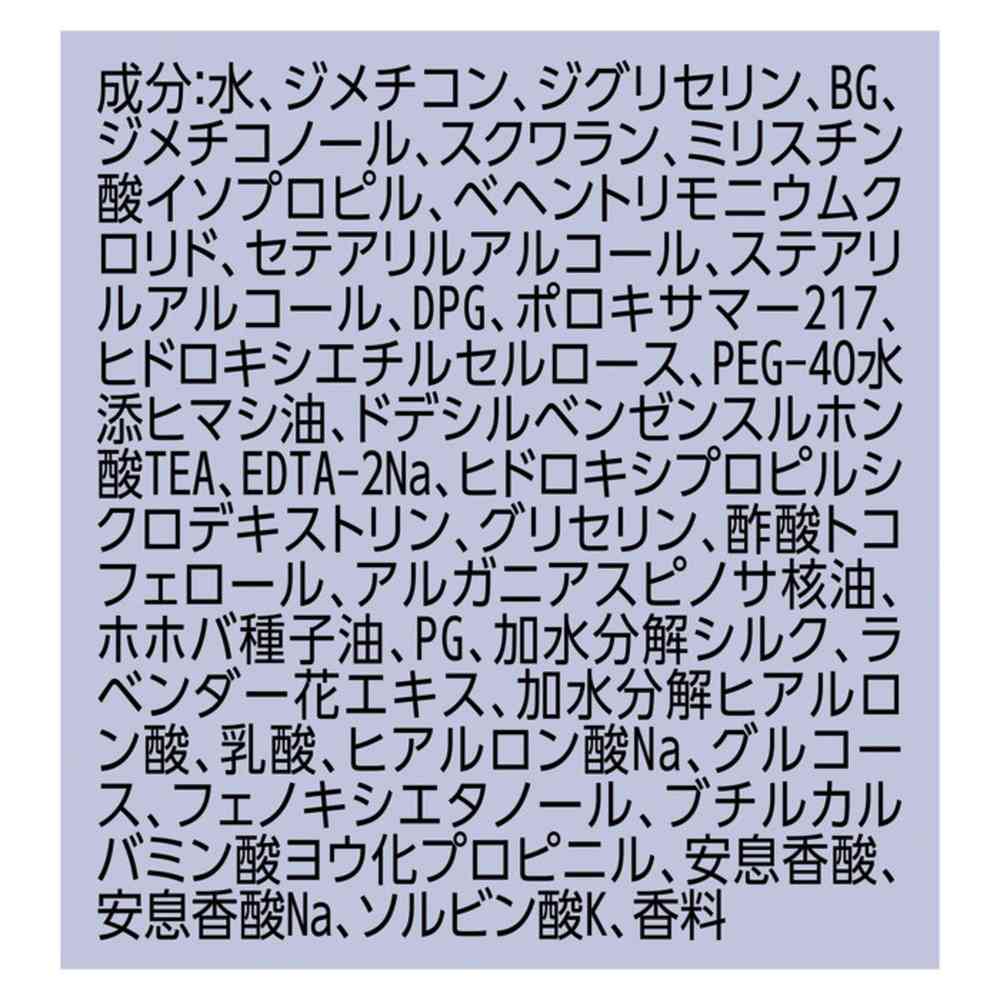 水、ジメチコン、ジグリセリン、BG、ジメチコノール、スクワラン、ミリスチン酸イソプロピル、ベヘントリモニウムクロリド、セテアリルアルコール、ステアリルアルコール、DPG、ポロキサマー217、ヒドロキシエチルセルロース、PEG-40水添ヒマシ油、ドデシルベンゼンスルホン酸TEA、EDTA-2Na、ヒドロキシプロピルシクロデキストリン、グリセリン、酢酸トコフェロール、アルガニアスピノサ核油、ホホバ種子油、PG、加水分解シルク、ラベンダー花エキス、加水分解ヒアルロン酸、乳酸、ヒアルロン酸Na、グルコース、フェノキシエタノール、ブチルカルバミン酸ヨウ化プロピニル、安息香酸、安息香酸Na、ソルビン酸K、香料