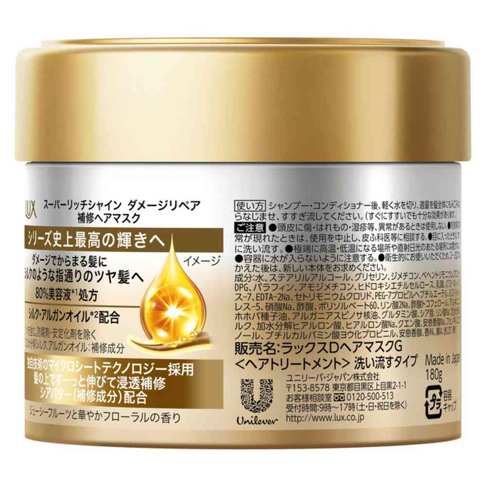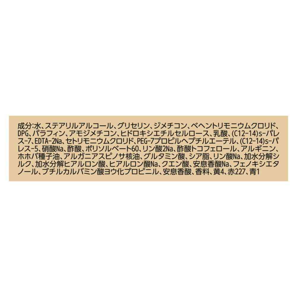 水、ステアリルアルコール、グリセリン、ジメチコン、ベヘントリモニウムクロリド、DPG、パラフィン、アモジメチコン、ヒドロキシエチルセルロース、乳酸、(C12-14)s-パレス-7、EDTA-2Na、セトリモニウムクロリド、PEG-7プロピルヘプチルエーテル、(C12-14)s-パレス-5、硝酸Na、酢酸、ポリソルベート60、リン酸2Na、酢酸トコフェロール、アルギニン、ホホバ種子油、アルガニアスピノサ核油、グルタミン酸、シア脂、リン酸Na、加水分解シルク、加水分解ヒアルロン酸、ヒアルロン酸Na、クエン酸、安息香酸Na、フェノキシエタノール、ブチルカルバミン酸ヨウ化プロピニル、安息香酸、香料、黄4、赤227、青1