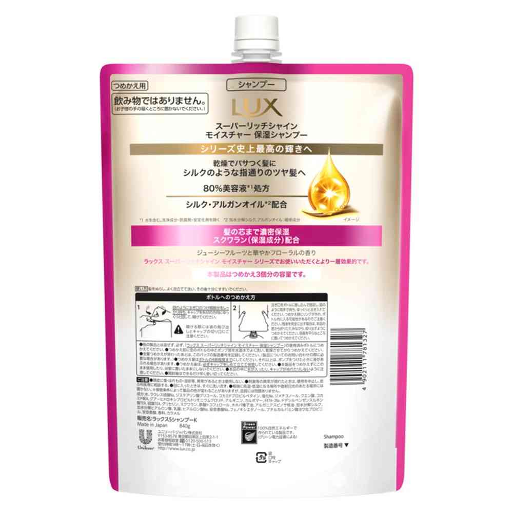 水、ラウレス硫酸Na、ジステアリン酸グリコール、コカミドプロピルベタイン、塩化Na、ジメチコノール、クエン酸、コカミドMEA、グアーヒドロキシプロピルトリモニウムクロリド、アルギニン、カルボマー、EDTA-2Na、ドデシルベンゼンスルホン酸TEA、硫酸TEA、グリセリン、スクワラン、酢酸トコフェロール、ホホバ種子油、アルガニアスピノサ核油、加水分解シルク、加水分解ヒアルロン酸、乳酸、ヒアルロン酸Na、安息香酸Na、フェノキシエタノール、ブチルカルバミン酸ヨウ化プロピニル、安息香酸、香料、カラメル