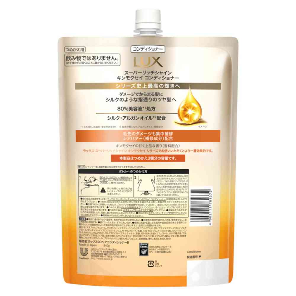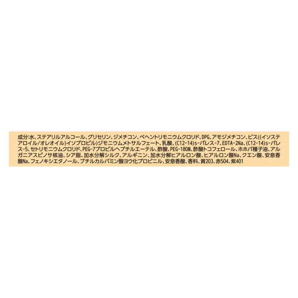 水、ステアリルアルコール、グリセリン、ジメチコン、ベヘントリモニウムクロリド、DPG、アモジメチコン、ビス((イソステアロイル/オレオイル)イソプロピル)ジモニウムメトサルフェート、乳酸、(C12-14)s-パレス-7、EDTA-2Na、(C12-14)s-パレス-5、セトリモニウムクロリド、PEG-7プロピルヘプチルエーテル、酢酸、PEG-180M、酢酸トコフェロール、ホホバ種子油、アルガニアスピノサ核油、シア脂、加水分解シルク、アルギニン、加水分解ヒアルロン酸、ヒアルロン酸Na、クエン酸、安息香酸Na、フェノキシエタノール、ブチルカルバミン酸ヨウ化プロピニル、安息香酸、香料、黄203、赤504、紫401