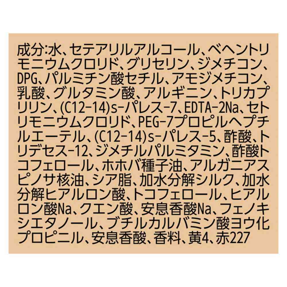 水、セテアリルアルコール、ベヘントリモニウムクロリド、グリセリン、ジメチコン、DPG、パルミチン酸セチル、アモジメチコン、乳酸、グルタミン酸、アルギニン、トリカプリリン、(C12-14)s-パレス-7、EDTA-2Na、セトリモニウムクロリド、PEG-7プロピルヘプチルエーテル、(C12-14)s-パレス-5、酢酸、トリデセス-12、ジメチルパルミタミン、酢酸トコフェロール、ホホバ種子油、アルガニアスピノサ核油、シア脂、加水分解シルク、加水分解ヒアルロン酸、トコフェロール、ヒアルロン酸Na、クエン酸、安息香酸Na、フェノキシエタノール、ブチルカルバミン酸ヨウ化プロピニル、安息香酸、香料、黄4、赤227
