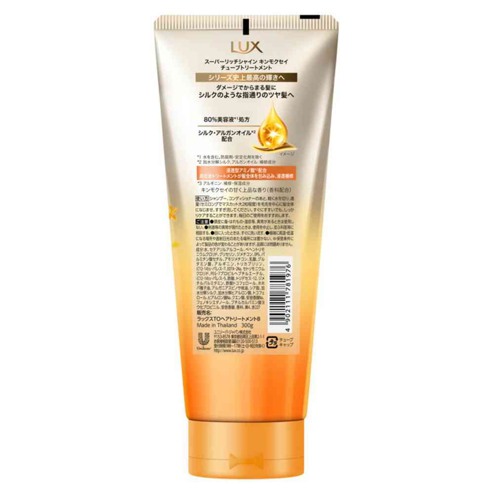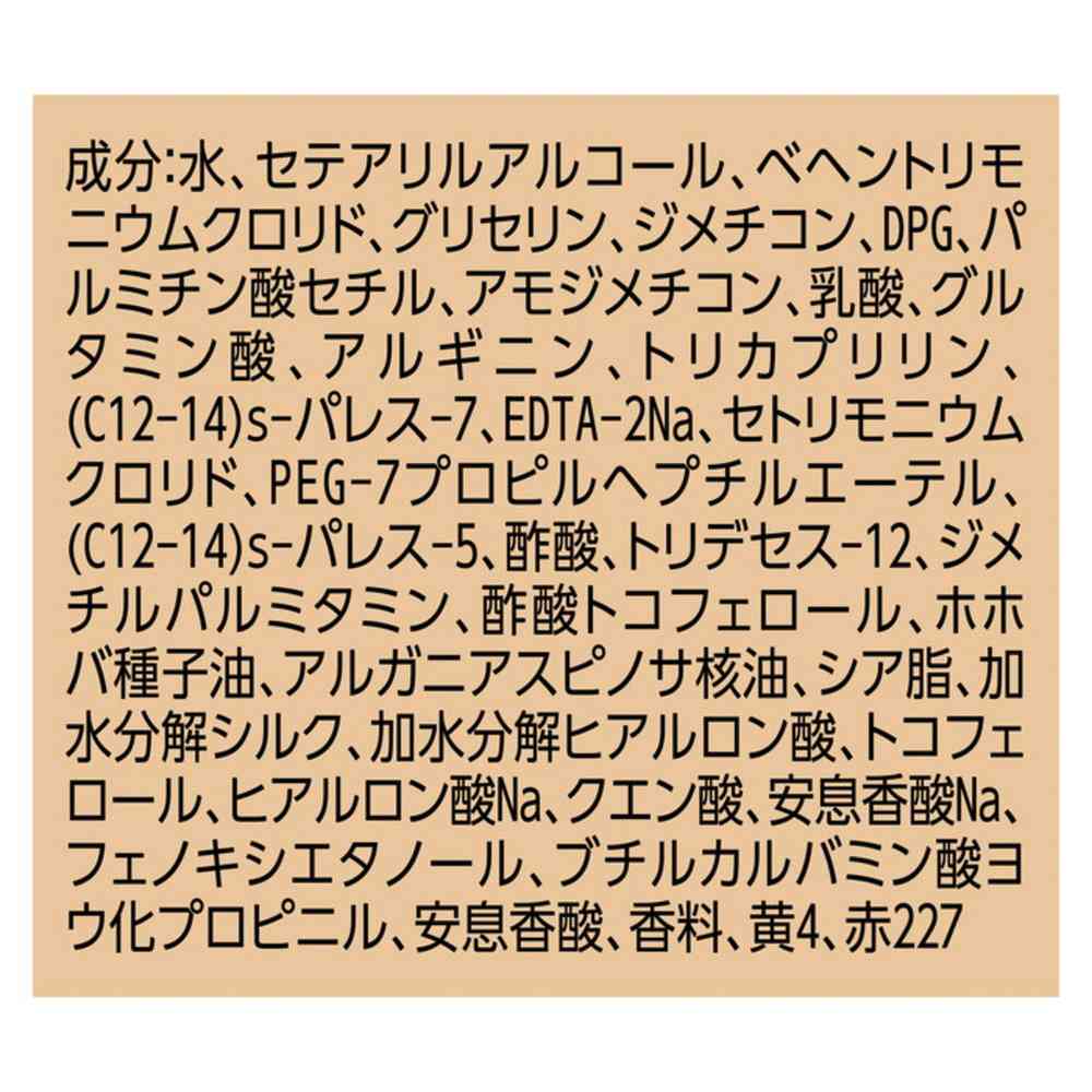 水、セテアリルアルコール、ベヘントリモニウムクロリド、グリセリン、ジメチコン、DPG、パルミチン酸セチル、アモジメチコン、乳酸、グルタミン酸、アルギニン、トリカプリリン、(C12-14)s-パレス-7、EDTA-2Na、セトリモニウムクロリド、PEG-7プロピルヘプチルエーテル、(C12-14)s-パレス-5、酢酸、トリデセス-12、ジメチルパルミタミン、酢酸トコフェロール、ホホバ種子油、アルガニアスピノサ核油、シア脂、加水分解シルク、加水分解ヒアルロン酸、トコフェロール、ヒアルロン酸Na、クエン酸、安息香酸Na、フェノキシエタノール、ブチルカルバミン酸ヨウ化プロピニル、安息香酸、香料、黄4、赤227
