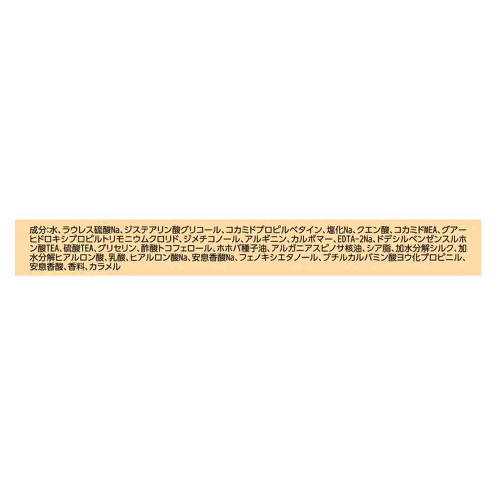 水、ラウレス硫酸Na、ジステアリン酸グリコール、コカミドプロピルベタイン、塩化Na、クエン酸、コカミドMEA、グアーヒドロキシプロピルトリモニウムクロリド、ジメチコノール、アルギニン、カルボマー、EDTA-2Na、ドデシルベンゼンスルホン酸TEA、硫酸TEA、グリセリン、酢酸トコフェロール、ホホバ種子油、アルガニアスピノサ核油、シア脂、加水分解シルク、加水分解ヒアルロン酸、乳酸、ヒアルロン酸Na、安息香酸Na、フェノキシエタノール、ブチルカルバミン酸ヨウ化プロピニル、安息香酸、香料、カラメル