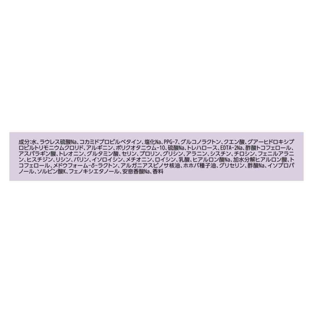 水、ラウレス硫酸Na、コカミドプロピルベタイン、塩化Na、PPG-7、グルコノラクトン、クエン酸、グアーヒドロキシプロピルトリモニウムクロリド、アルギニン、ポリクオタニウム-10、硫酸Na、トレハロース、EDTA-2Na、酢酸トコフェロール、アスパラギン酸、トレオニン、グルタミン酸、セリン、プロリン、グリシン、アラニン、シスチン、チロシン、フェニルアラニン、ヒスチジン、リシン、バリン、イソロイシン、メチオニン、ロイシン、乳酸、ヒアルロン酸Na、加水分解ヒアルロン酸、トコフェロール、メドウフォーム-δ-ラクトン、アルガニアスピノサ核油、ホホバ種子油、グリセリン、酢酸Na、イソプロパノール、ソルビン酸K、フェノキシエタノール、安息香酸Na、香料