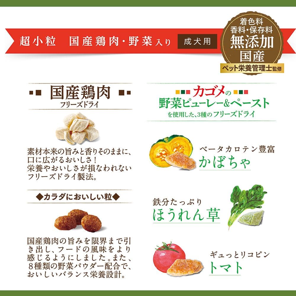 食べやすい超小粒。素材のおいしさと栄養がとれる、国産鶏肉と野菜ピューレーフリーズドライ入り