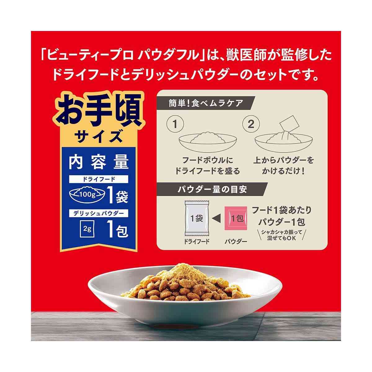 成犬用の粒とチキン味パウダーのセットでおいしく健康的に食べムラケア。 試しやすいお手頃サイズ。