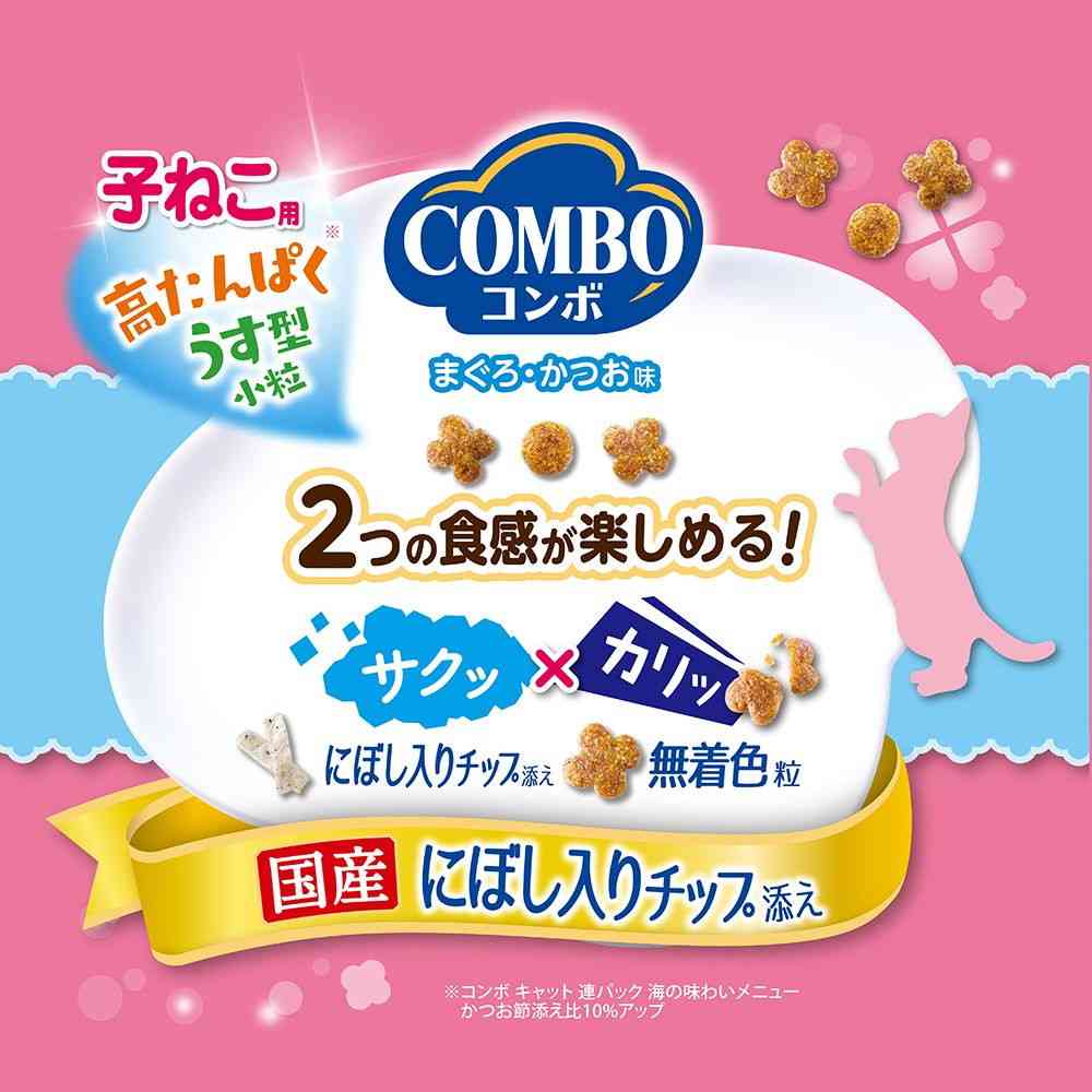 まぐろとかつお味のうす型小粒にサクッと食感のにぼし入りチップを添えた子ねこ用。 食べきりサイズ。