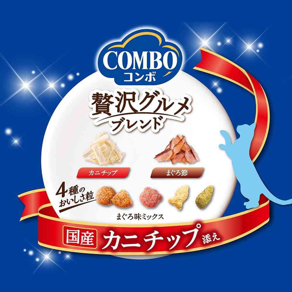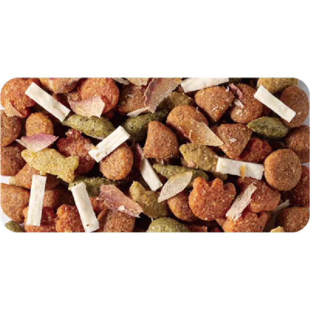 穀類(トウモロコシ、コーングルテンミール、小麦粉、パン粉、小麦タンパク)、肉類(チキンミール、牛肉粉、豚肉粉)、魚介類(フィッシュミール、マグロブシ、フィッシュパウダー、魚肉すり身、カニ粉末、マグロエキス、小魚粉末、カツオ節粉、カツオエキス、シラスパウダー)、油脂類(動物性油脂、植物性油脂)、豆類(脱脂大豆、大豆タンパク)、でん粉、糖類(砂糖、オリゴ糖)、食塩、ハーブ(タイム、ディル、フェンネル)、野菜類(トマト、ニンジン、ホウレンソウ)、クランベリーパウダー、ミネラル類(カルシウム、リン、カリウム、ナトリウム、クロライド、鉄、銅、マンガン、亜鉛、ヨウ素、コバルト)、pH調整剤、アミノ酸類(タウリン、トリプトファン、メチオニン、リジン)、ビタミン類(A、B1、B2、B6、B12、D、E、K、ニコチン酸、パントテン酸、ビオチン、葉酸、コリン、アスコルビン酸カルシウム)、ソルビトール、増粘安定剤(加工でん粉)、酵母細胞壁、調味料、着色料(二酸化チタン、食用赤色102号、食用赤色106号、食用黄色4号、食用黄色5号、食用青色1号)、酸化防止剤(ミックストコフェロール、ローズマリー抽出物、ハーブ抽出物)、グルコサミン、コンドロイチン たんぱく質29.0%以上、脂質9.0%以上、粗繊維3.0%以下、灰分9.0%以下、水分10.0%以下、カルシウム0.9%以上、リン0.8%以上、マグネシウム標準値0.12%