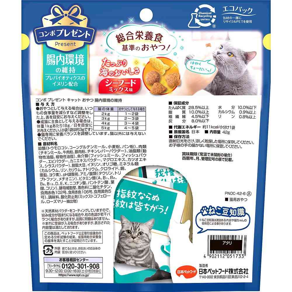 穀類(トウモロコシ、コーングルテンミール、小麦粉、パン粉)、肉類(チキンミール、牛肉粉、豚肉粉、チキンレバーパウダー)、油脂類(動物性油脂、植物性油脂)、魚介類(フィッシュミール、フィッシュパウダー、エビパウダー、カニエキスパウダー、マグロエキス、カツオエキス、シラスパウダー)、脱脂大豆、イヌリン、オリゴ糖、ミネラル類(カルシウム、リン、カリウム、ナトリウム、クロライド、銅、亜鉛、ヨウ素)、pH調整剤、アミノ酸類(タウリン、トリプトファン、メチオニン)、ビタミン類(A、B1、B2、B6、B12、D、E、K、ニコチン酸、パントテン酸、葉酸、コリン)、酵母細胞壁、着色料(二酸化チタン、食用赤色102号、食用赤色106号、食用黄色5号)、調味料、酸化防止剤(ミックストコフェロール、ローズマリー抽出物) たんぱく質28.5%以上、脂質10.0%以上、粗繊維4.5%以下、灰分8.0%以下、水分10.0%以下、カルシウム0.9%以上、リン0.8%以上