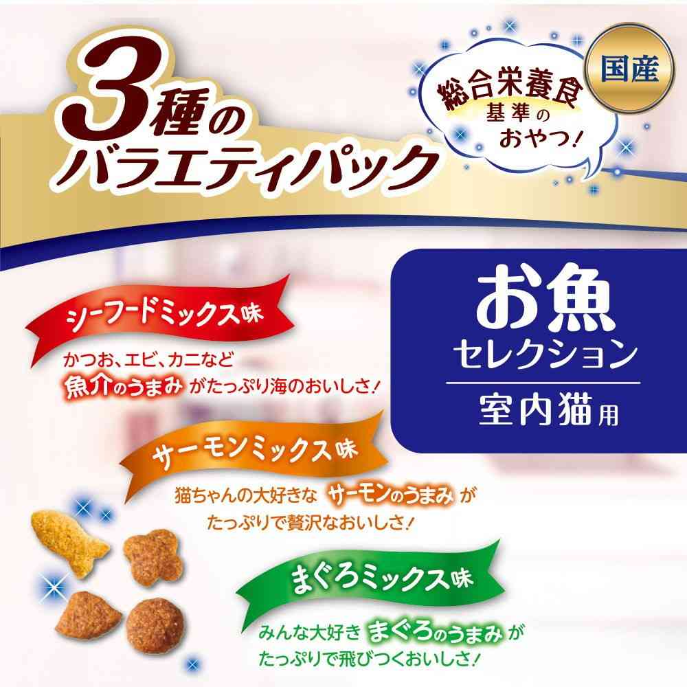 【サーモン味】穀類(トウモロコシ、コーングルテンミール、小麦粉、パン粉)、肉類(チキンミール、牛肉粉、豚肉粉、チキンレバーパウダー)、油脂類(動物性油脂、植物性油脂)、魚介類(フィッシュミール、フィッシュパウダー、サーモンエキスパウダー、マグロエキス、カツオエキス、シラスパウダー)、脱脂大豆、オリゴ糖、ミネラル類(カルシウム、リン、カリウム、ナトリウム、クロライド、銅、亜鉛、ヨウ素)、pH調整剤、アミノ酸類(タウリン、トリプトファン、メチオニン)、ビタミン類(A、B1、B2、B6、B12、D、E、K、ニコチン酸、パントテン酸、葉酸、コリン)、酵母細胞壁、着色料(二酸化チタン、食用赤色102号、食用赤色106号、食用黄色5号)、酸化防止剤(ミックストコフェロール、ローズマリー抽出物)【シーフードミックス味】穀類(トウモロコシ、コーングルテンミール、小麦粉、パン粉)、肉類(チキンミール、牛肉粉、豚肉粉、チキンレバーパウダー)、油脂類(動物性油脂、植物性油脂)、魚介類(フィッシュミール、フィッシュパウダー、エビパウダー、カニエキスパウダー、マグロエキス、カツオエキス、シラスパウダー)、脱脂大豆、オリゴ糖、ミネラル類(カルシウム、リン、カリウム、ナトリウム、クロライド、銅、亜鉛、ヨウ素)、pH調整剤、アミノ酸類(タウリン、トリプトファン、メチオニン)、ビタミン類(A、B1、B2、B6、B12、D、E、K、ニコチン酸、パントテン酸、葉酸、コリン)、酵母細胞壁、着色料(二酸化チタン、食用赤色102号、食用赤色106号、食用黄色5号)、調味料、酸化防止剤(ミックストコフェロール、ローズマリー抽出物)【まぐろミックス味】穀類(トウモロコシ、コーングルテンミール、小麦粉、パン粉)、肉類(チキンミール、牛肉粉、豚肉粉、チキンレバーパウダー)、油脂類(動物性油脂、植物性油脂)、魚介類(フィッシュミール、フィッシュパウダー、マグロ節粉、マグロエキス、カツオエキス、シラスパウダー)、脱脂大豆、オリゴ糖、ミネラル類(カルシウム、リン、カリウム、ナトリウム、クロライド、銅、亜鉛、ヨウ素)、pH調整剤、アミノ酸類(タウリン、トリプトファン、メチオニン)、ビタミン類(A、B1、B2、B6、B12、D、E、K、ニコチン酸、パントテン酸、葉酸、コリン)、酵母細胞壁、着色料(二酸化チタン、食用赤色102号、食用赤色106号、食用黄色5号)、酸化防止剤(ミックストコフェロール、ローズマリー抽出物) たんぱく質28.5%以上、脂質10.0%以上、粗繊維4.5%以下、灰分8.0%以下、水分10.0%以下、カルシウム0.9%以上、リン0.8%以上