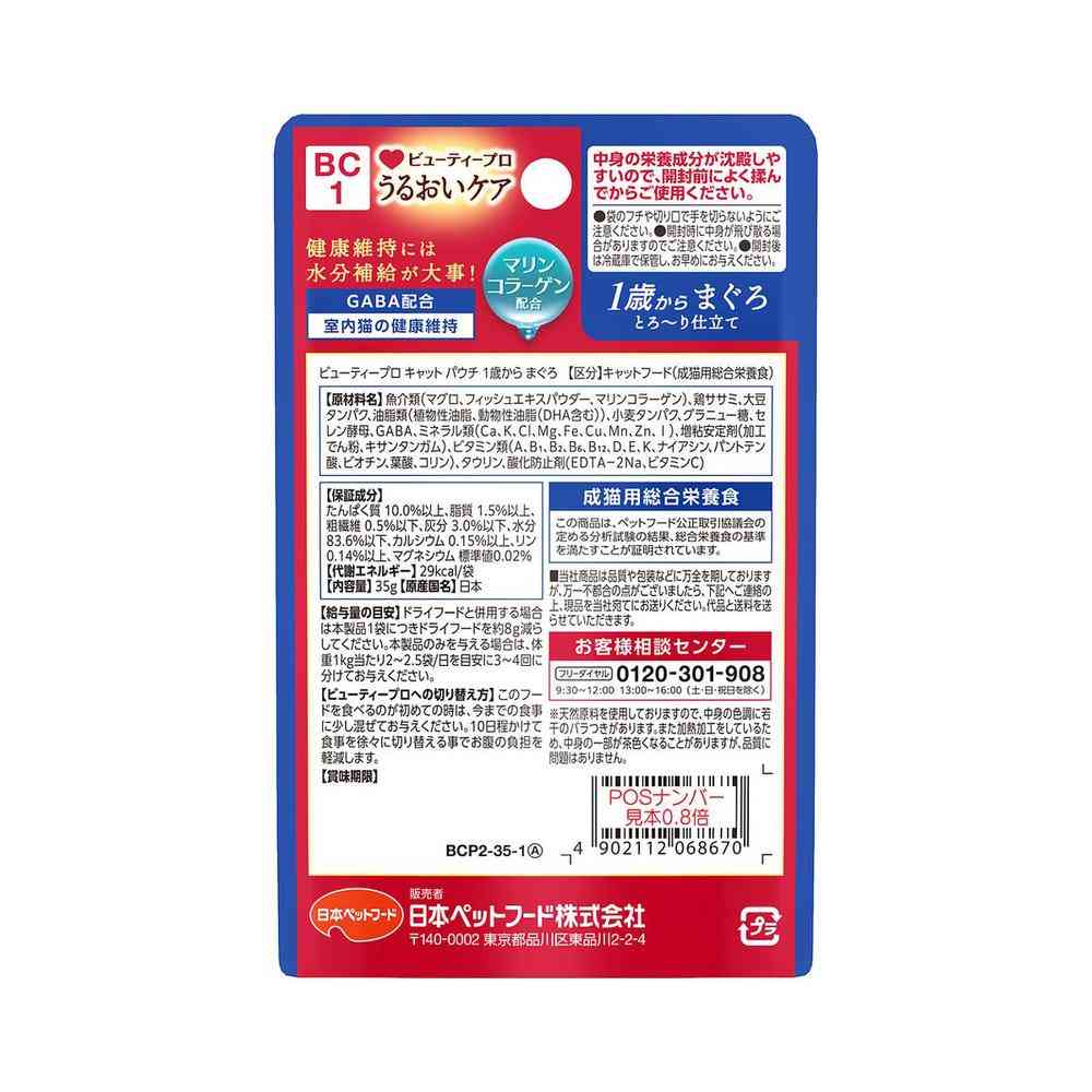 魚介類(マグロ、フィッシュエキスパウダー、マリンコラーゲン)、鶏ササミ、大豆タンパク、油脂類(植物性油脂、動物性油脂(DHA含む))、小麦タンパク、グラニュー糖、セレン酵母、GABA、ミネラル類(Ca、K、Cl、Mg、Fe、Cu、Mn、Zn、I)、増粘安定剤(加工でん粉、キサンタンガム)、ビタミン類(A、B1、B2、B6、B12、D、E、K、ナイアシン、パントテン酸、ビオチン、葉酸、コリン)、タウリン、酸化防止剤(EDTA-2Na、ビタミンC) たんぱく質10.0%以上、脂質1.5%以上、粗繊維0.5%以下、灰分3.0%以下、水分83.6%以下、カルシウム0.15%以上、リン0.14%以上、マグネシウム0.02%(標準値)