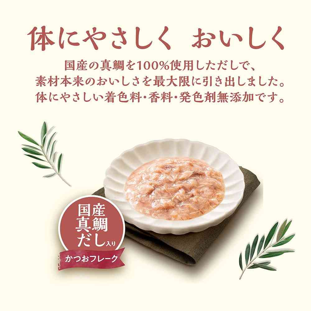 着色料・香料・発色剤無添加のピュアなおいしさ。 かつおフレークのうまみ引き出す国産真鯛だし入り。
