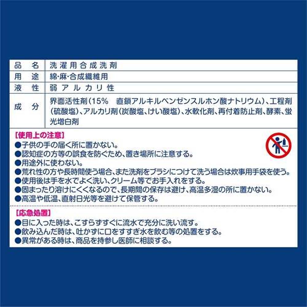 ●子供の手の届く所に置かない。 ●認知症の方等の誤飲を防ぐため、置き場所に注意する。 ●用途外に使わない。 ●荒れ性の方や長時間使用する場合、また洗剤をブラシにつけて洗う場合は炊事用手袋を使う。 ●使用後は手を水でよく洗い、クリーム等でお手入れをする。 ●固まったり溶けにくくなるので、長期間の保存は避け、高温多湿の所に置かない。 ●高温や低温、直射日光等を避けて保管する。 ●目に入った時は、こすらずすぐに流水で充分に洗い流す。 ●飲み込んだ時は、吐かずに口をすすぎ、水を飲む等の処置をする。 ●異常がある時は、商品を持参し医師に相談する。