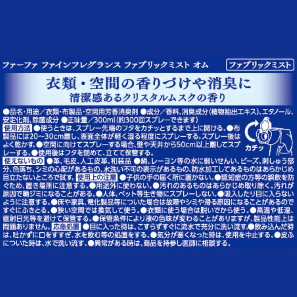 ファブリックミスト、ミスト、除菌、消臭、芳香、衣類、しわ取り、ニオイ取り、ニオイ、臭い、くさい、コート、スーツ、ジーンズ、カーテン、カーペット、絨毯、お部屋の臭い、部屋、香りづけ、香り、オム、本体、ボトル、スプレー、FaFa、FAFA、FINE、FRAGRANCE、FABRIC、SOFTENER、HOMME