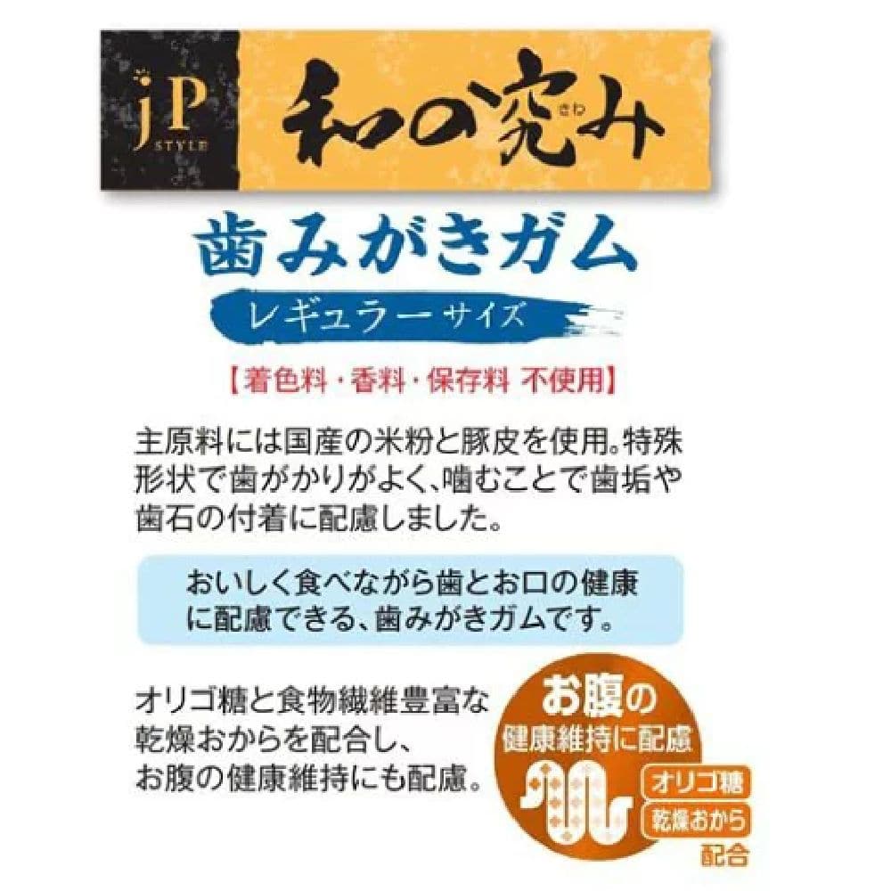 ペット、ペットフード、犬、トリーツ、-、歯みがきガム、国産素材、米粉、豚皮、オリゴ糖、特殊形状、噛むことで歯垢や歯石の不着に配慮、レギュラー