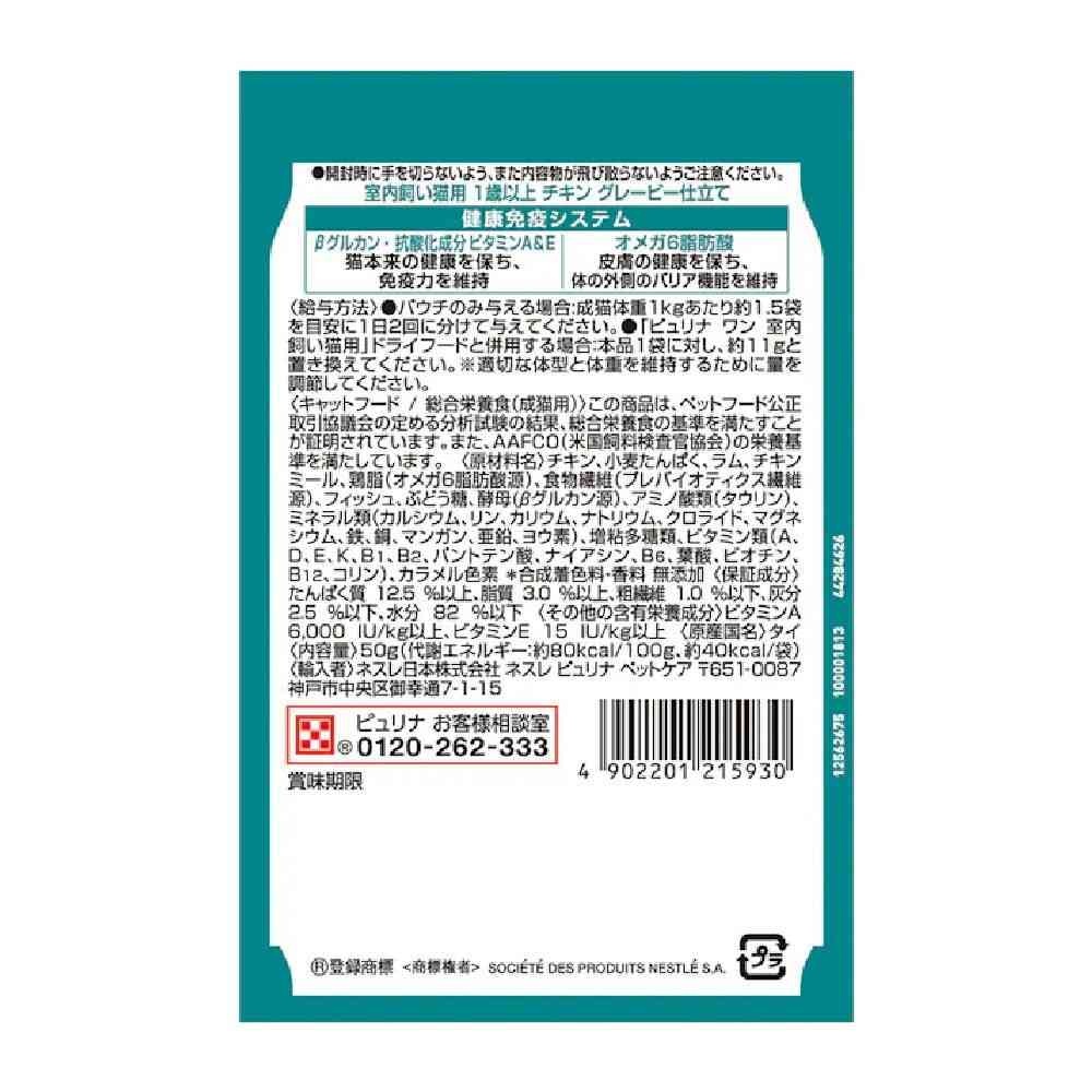 ●パウチのみ与える場合:成猫体重1kgあたり約1.5袋を目安に1日2回に分けて与えてください。 ●「ピュリナワン室内飼い猫用」ドライフードと併用する場合:本品1袋に対し、約11gと置き換えてください。※適切な体型と体重を維持するために量を調節してください。