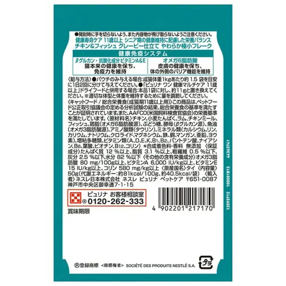 ●パウチのみ与える場合:成猫体重1kgあたり 約 1.5袋を目安に1日2回に分けて与えてください。●「ピュリナ ワン 健康マルチケア 11歳以上」ドライフードと併用する場合:本品1袋に対し、約11gと置き換えてください。※適切な体型と体重を維持するために量を調節してください。