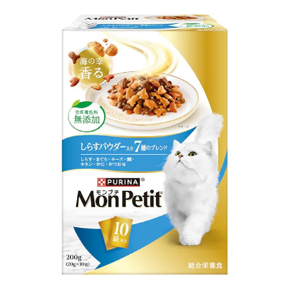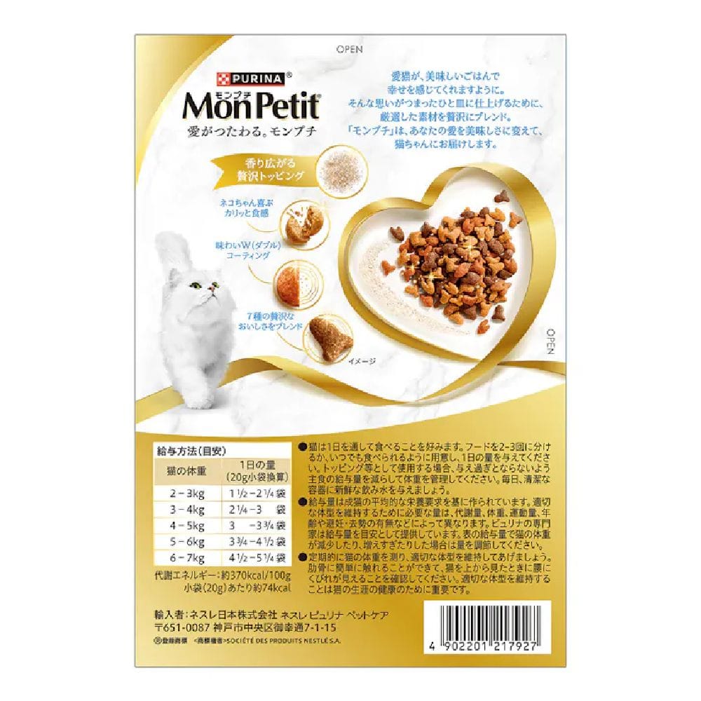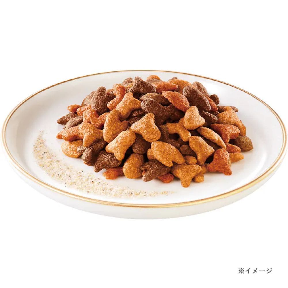 穀類(とうもろこし、とうもろこしたんぱく、小麦、米等)、肉類(チキンミール等)、動物性油脂、魚介類(まぐろ、かつお、しらすパウダー)、たんぱく加水分解物、フレーバーブレンド(鯛、かに、チーズ等)、ミネラル類(カルシウム、リン、カリウム、ナトリウム、クロライド、鉄、銅、マンガン、亜鉛、ヨウ素、セレン)、ビタミン類(A、E、K、B1、B2、パントテン酸、ナイアシン、B6、葉酸、ビオチン、B12、コリン)、アミノ酸類(メチオニン、タウリン)、着色料(カラメル色素、カロテノイド色素)