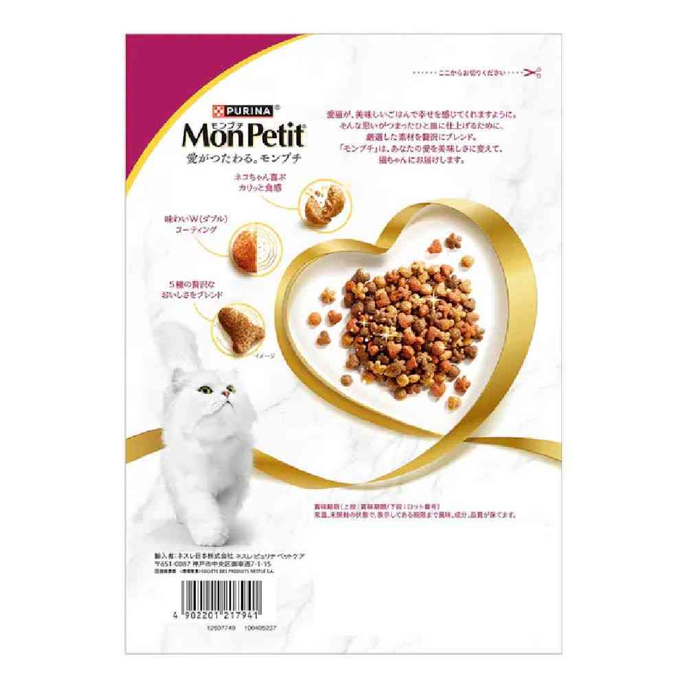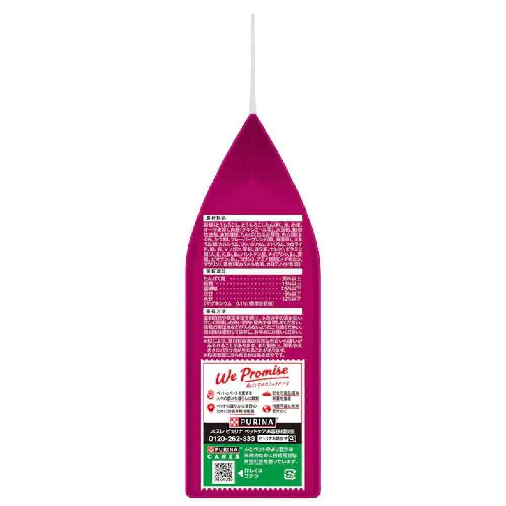 穀類(とうもろこし、とうもろこしたんぱく、米、小麦、オーツ麦等)、肉類(チキンミール等)、大豆粉、動物性油脂、食物繊維、たんぱく加水分解物、魚介類(まぐろ、かつお)、フレーバーブレンド(鯛、海藻等)、ミネラル類(カルシウム、リン、カリウム、ナトリウム、クロライド、鉄、銅、マンガン、亜鉛、ヨウ素、セレン)、ビタミン類(A、E、K、B1、B2、パントテン酸、ナイアシン、B6、葉酸、ビオチン、B12、コリン)、アミノ酸類(メチオニン、タウリン)、着色料(カラメル色素、カロテノイド色素)