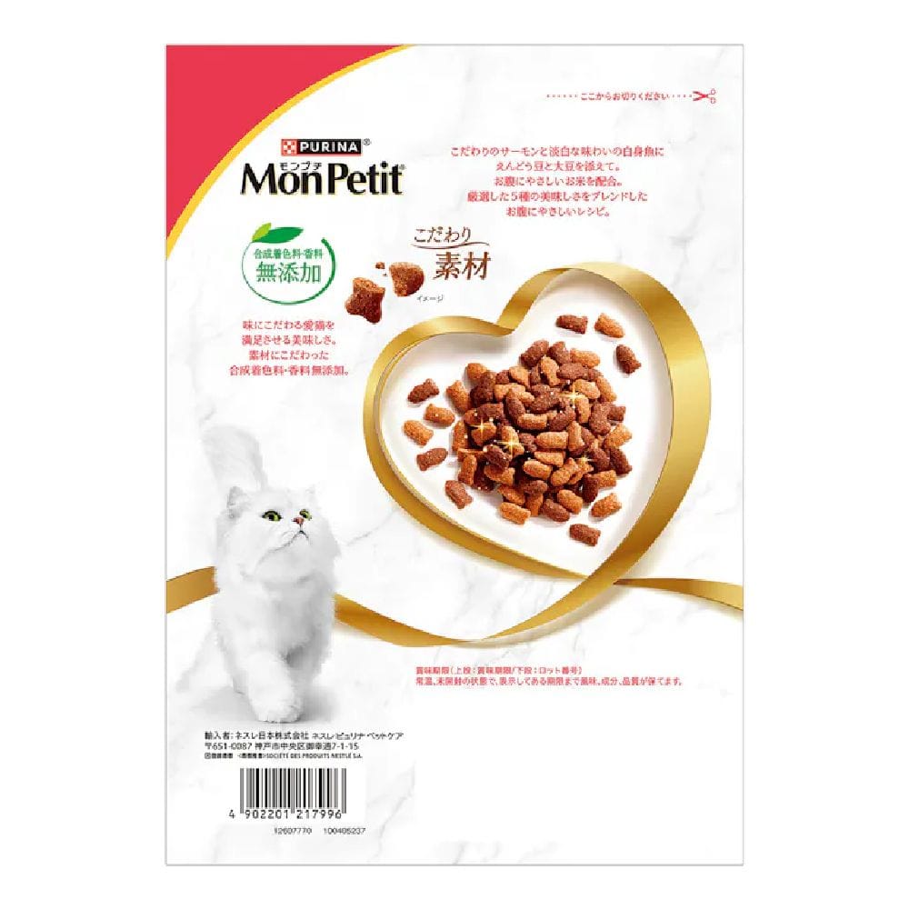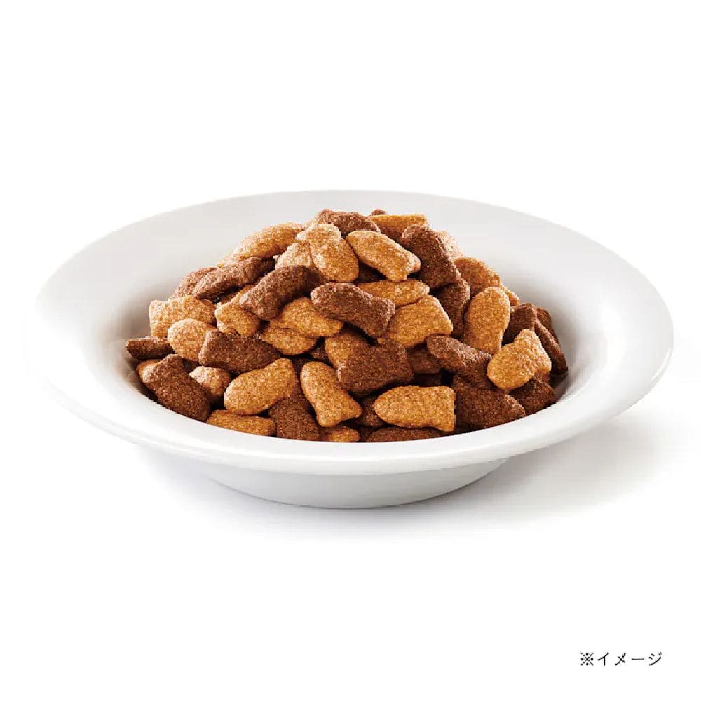 穀類(小麦、コーングルテン、米 等)、肉類(家禽ミール 等)、動物性油脂、たんぱく加水分解物、豆類(脱脂大豆、えんどう豆)、フィッシュパウダー(サーモン、白身魚)、ミネラル類(カルシウム、リン、カリウム、ナトリウム、クロライド、マグネシウム、鉄、銅、マンガン、亜鉛、ヨウ素、セレン)、ビタミン類(A、D、E、B1、B2、パントテン酸、ナイアシン、B6、葉酸、ビオチン、B12、コリン)、カラメル色素、アミノ酸類(タウリン)