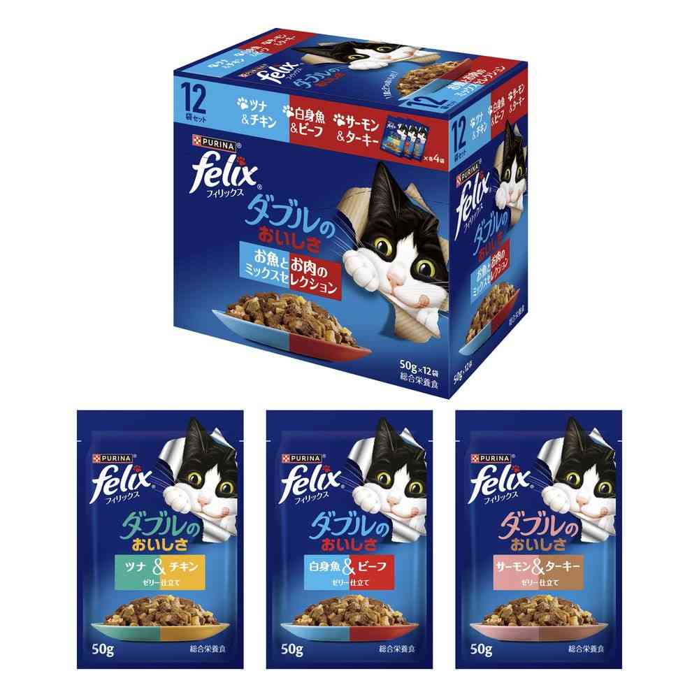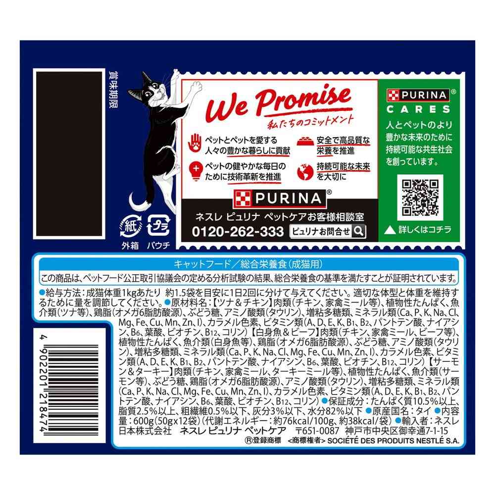 <ツナ&チキン>肉類(チキン、家禽ミール等)、植物性たんぱく、魚介類(ツナ等)、鶏脂(オメガ6脂肪酸源)、ぶどう糖、アミノ酸類(タウリン)、増粘多糖類、ミネラル類(Ca、P、K、Na、Cl、Mg、Fe、Cu、Mn、Zn、I)、カラメル色素、ビタミン類(A、D、E、K、B1、B2、パントテン酸、ナイアシン、B6、葉酸、ビオチン、B12、コリン)<白身魚&ビーフ>肉類(チキン、家禽ミール、ビーフ等)、植物性たんぱく、魚介類(白身魚等)、鶏脂(オメガ6脂肪酸源)、ぶどう糖、アミノ酸類(タウリン)、増粘多糖類、ミネラル類(Ca、P、K、Na、Cl、Mg、Fe、Cu、Mn、Zn、I)、カラメル色素、ビタミン類(A、D、E、K、B1、B2、パントテン酸、ナイアシン、B6、葉酸、ビオチン、B12、コリン)<サーモン&ターキー>肉類(チキン、家禽ミール、ターキーミール等)、植物性たんぱく、魚介類(サーモン等)、ぶどう糖、鶏脂(オメガ6脂肪酸源)、アミノ酸類(タウリン)、増粘多糖類、ミネラル類(Ca、P、K、Na、Cl、Mg、Fe、Cu、Mn、Zn、I)、カラメル色素、ビタミン類(A、D、E、K、B1、B2、パントテン酸、ナイアシン、B6、葉酸、ビオチン、B12、コリン) たんぱく質:10.5%以上、脂質:2.5%以上、粗繊維:0.5%以下、灰分3%以下、水分82%以下