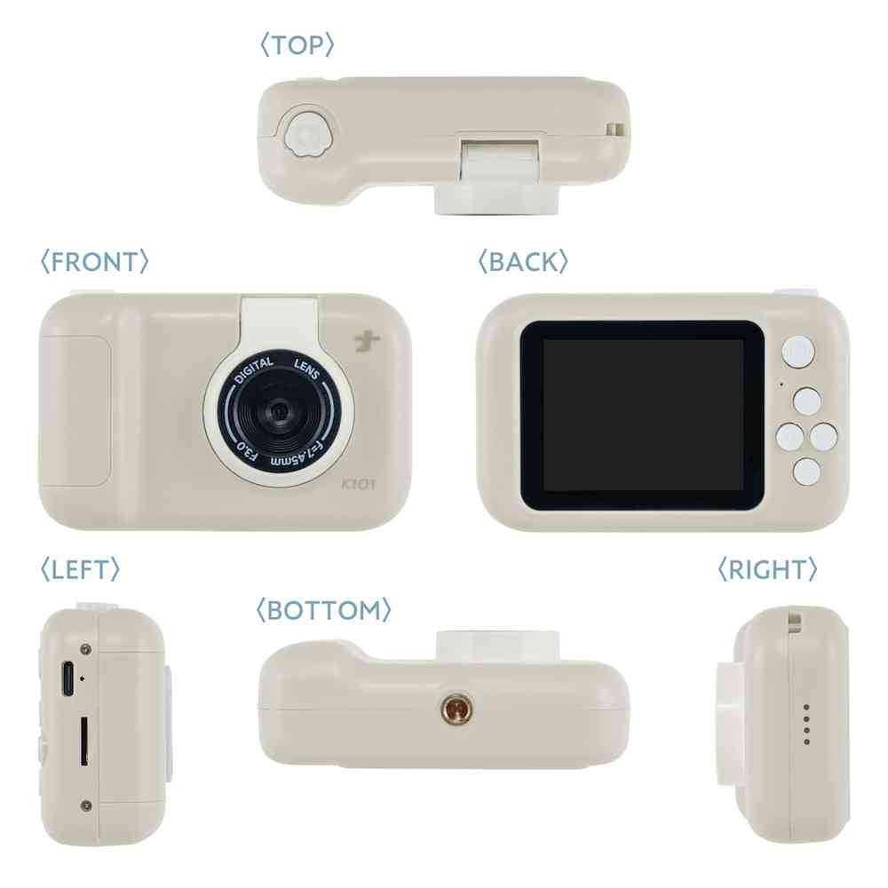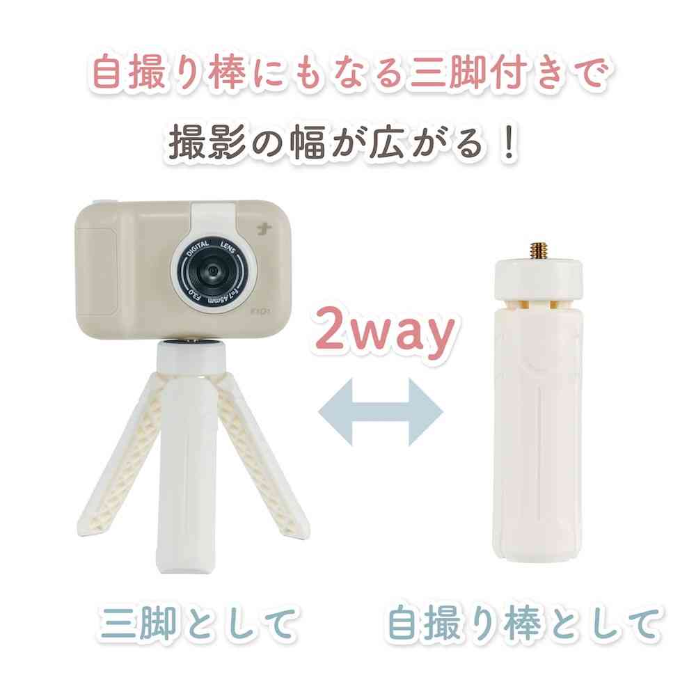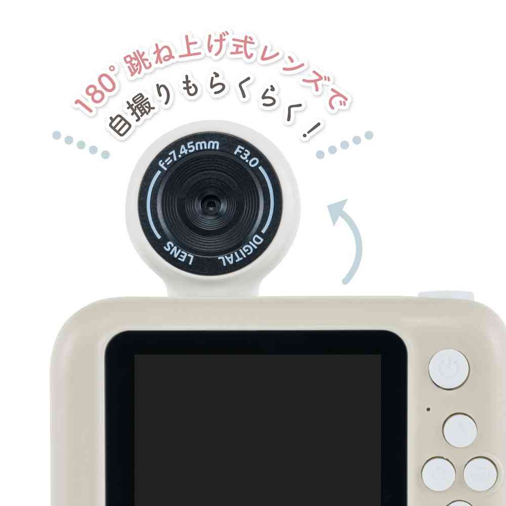 くすみカラーとコロンとしたフォルムが可愛いキッズカメラ。 レンズ部分が反転して内カメラになるので自撮りも可能です。 動画撮影もOK。 2.4インチモニター付。