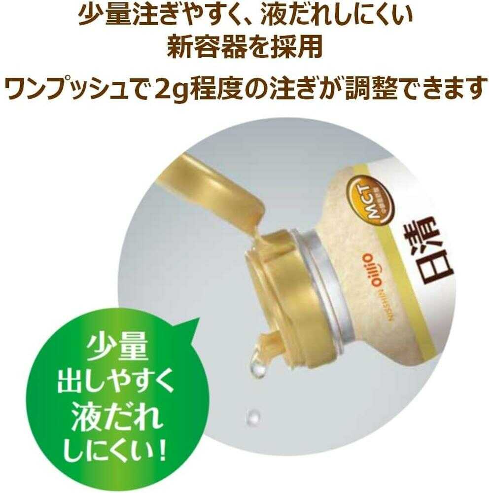 【原材料名】MCT(中鎖脂肪酸油)(スペイン製造) 【栄養成分表示(2gあたり)】熱量18kcal、たんぱく質0g、脂質2g、炭水化物0g、食塩相当量0g
