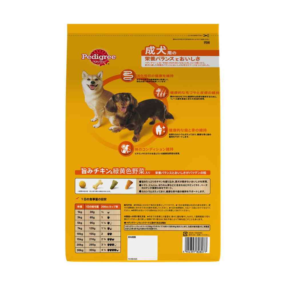 体重1kg:30g(200ccカップ1/2) 3kg:70g(200ccカップ1) 5kg:100g(200ccカップ1&1/4) 7kg:125g(200ccカップ1&3/4) 10kg:165g(200ccカップ2) 15kg:220g(200ccカップ2&3/4) 20kg:275g(200ccカップ3&1/2) 30kg:370g(200ccカップ4&3/4) 1日の食事量を、2回程度に分けて与えてください。 ペディグリーウエットフードと混ぜて与える場合、ペディグリーウェットフード(70gパウチタイプ)を約1/2袋(35g)加えたときに、給与量から本製品大さじ1.5杯(約10g)を減らすのが目安です。