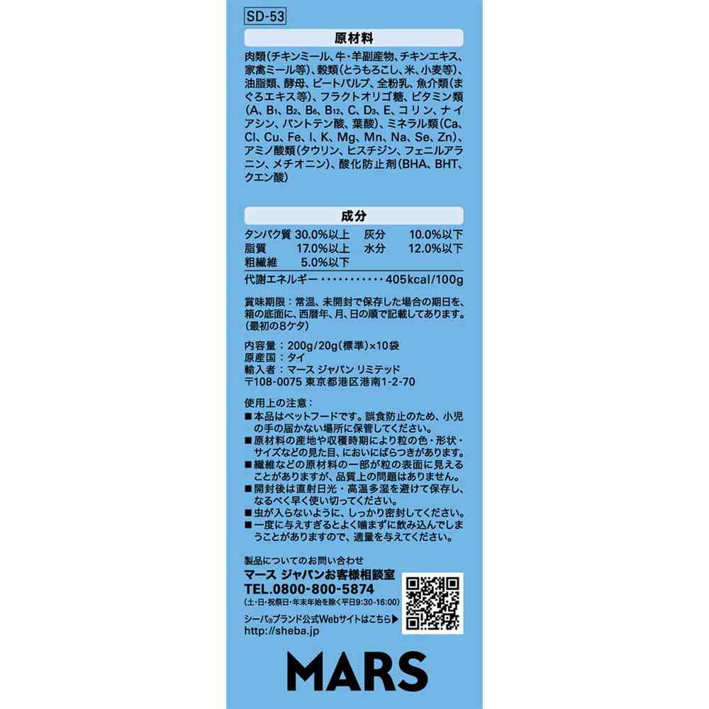 肉類(チキンミール、牛・羊副産物、チキンエキス、家禽ミール等)、穀類(とうもろこし、米、小麦等)、油脂類、酵母、ビートパルプ、全粉乳、魚介類(まぐろエキス等)、フラクトオリゴ糖、ビタミン類(A、B1、B2、B6、B12、C、D3、E、コリン、ナイアシン、パントテン酸、葉酸)、ミネラル類(Ca、Cl、Cu、Fe、I、K、Mg、Mn、Na、Se、Zn)、アミノ酸類(タウリン、ヒスチジン、フェニルアラニン、メチオニン)、酸化防止剤(BHA、BHT、クエン酸)