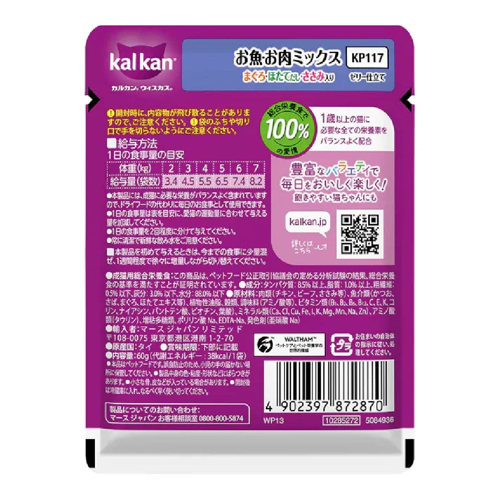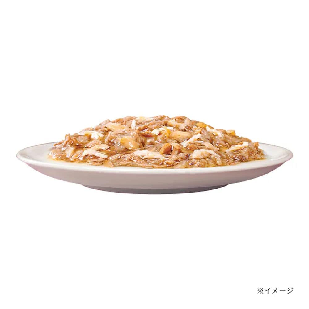 肉類(チキン、ビーフ、ささみ等)、魚介類(かつお、さば、まぐろ、ほたてエキス等)、植物性油脂、穀類、調味料(アミノ酸等)、ビタミン類(B1、B2、B6、B12、C、E、K、コリン、ナイアシン、パントテン酸、ビオチン、葉酸)、ミネラル類(Ca、Cl、Cu、Fe、I、K、Mg、Mn、Na、Zn)、アミノ酸類(タウリン)、増粘多糖類、ポリリン酸Na、EDTA-Na、発色剤(亜硝酸Na)