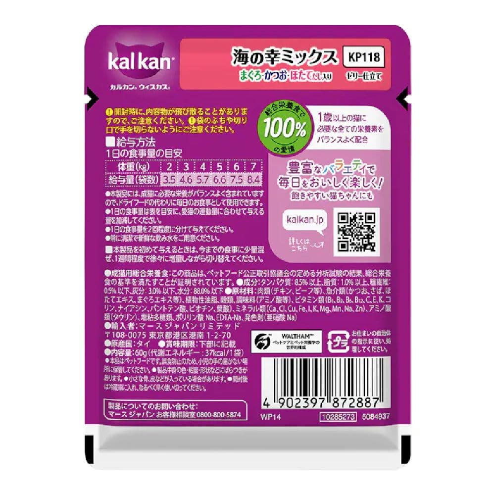 肉類(チキン、ビーフ等)、魚介類(かつお、さば、ほたてエキス、まぐろエキス等)、植物性油脂、穀類、調味料(アミノ酸等)、ビタミン類(B1、B2、B6、B12、C、E、K、コリン、ナイアシン、パントテン酸、ビオチン、葉酸)、ミネラル類(Ca、Cl、Cu、Fe、I、K、Mg、Mn、Na、Zn)、アミノ酸類(タウリン)、増粘多糖類、ポリリン酸Na、EDTA-Na、発色剤(亜硝酸Na)