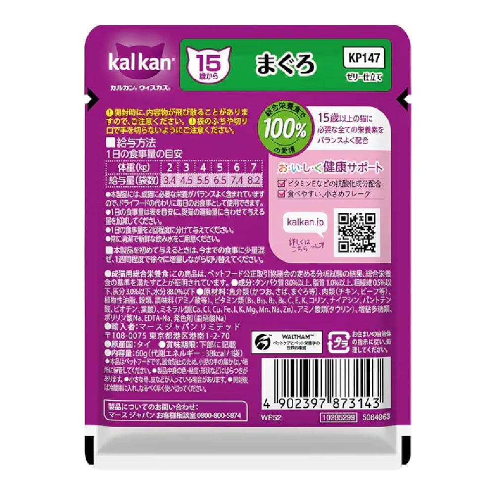 魚介類(かつお、さば、まぐろ等)、肉類(チキン、ビーフ等)、植物性油脂、穀類、調味料(アミノ酸等)、ビタミン類(B1、B12、B2、B6、C、E、K、コリン、ナイアシン、パントテン酸、ビオチン、葉酸)、ミネラル類(Ca、Cl、Cu、Fe、I、K、Mg、Mn、Na、Zn)、アミノ酸類(タウリン)、増粘多糖類、ポリリン酸Na、EDTA-Na、発色剤(亜硝酸Na)