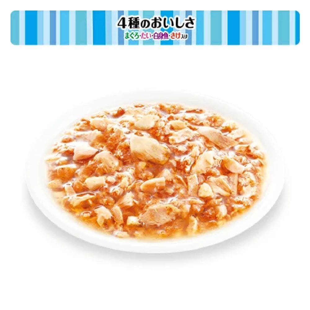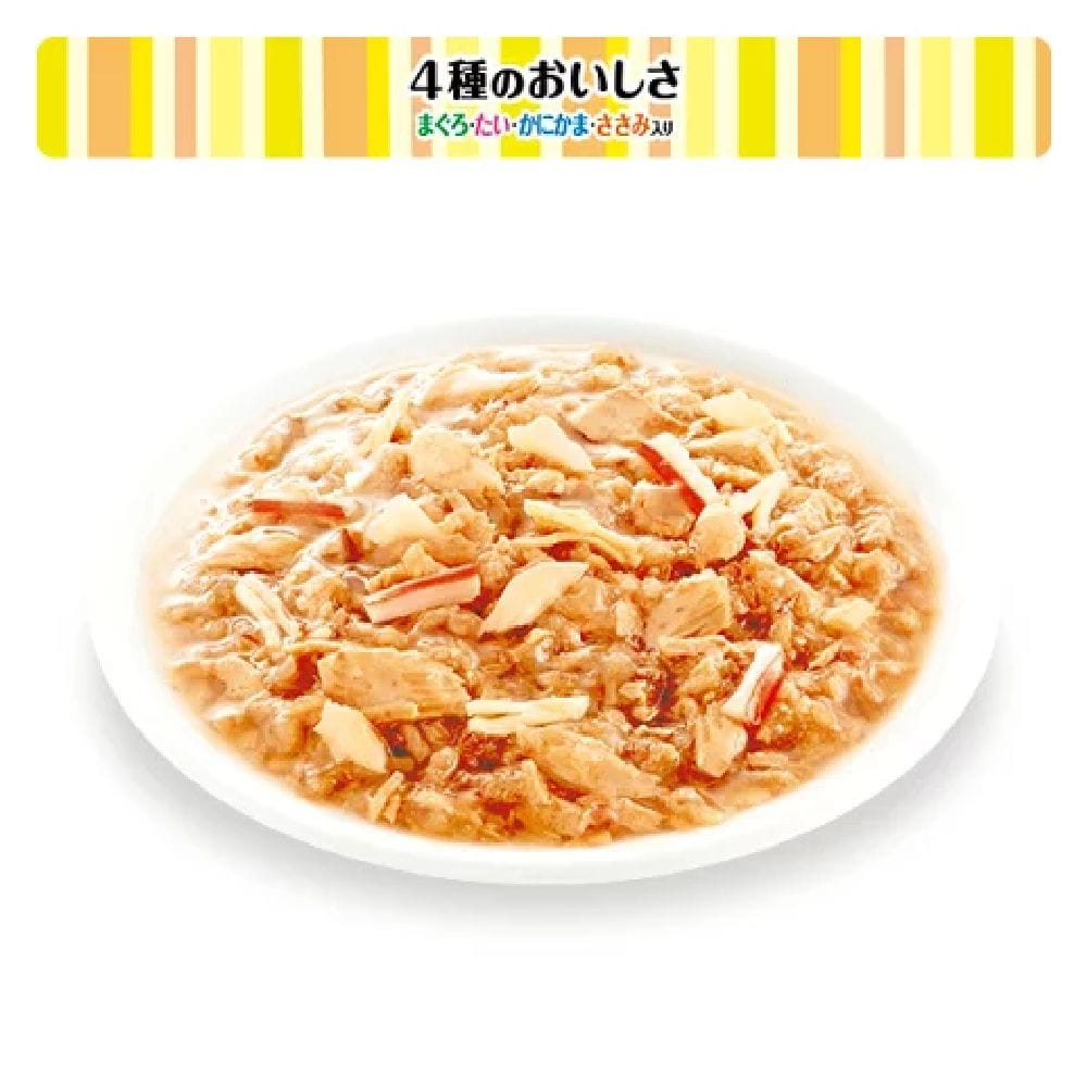 【4種のおいしさ まぐろ・たい・かにかま・ささみ入り】肉類(チキン、ビーフ、ささみ等)、魚介類(かつお、さば、白身魚、まぐろエキス、たいエキス等)、かにかま、植物性油脂、穀類、調味料(アミノ酸等)、ビタミン類(B1、B2、B6、B12、C、E、K、コリン、ナイアシン、パントテン酸、ビオチン、葉酸)、ミネラル類(Ca、Cl、Cu、Fe、I、K、Mg、Mn、Na、Zn)、アミノ酸類(タウリン)、増粘多糖類、ポリリン酸Na、EDTA-Na、発色剤(亜硝酸Na)、リコピン色素【4種のおいしさ まぐろ・たい・白身魚・さけ入り】魚介類(かつお、さば、さけ、白身魚、まぐろエキス、たいエキス等)、肉類(チキン、ビーフ等)、植物性油脂、穀類、調味料(アミノ酸等)、ビタミン類(B1、B2、B6、B12、C、E、K、コリン、ナイアシン、パントテン酸、ビオチン、葉酸)、ミネラル類(Ca、Cl、Cu、Fe、I、K、Mg、Mn、Na、Zn)、アミノ酸類(タウリン)、増粘多糖類、ポリリン酸Na、EDTA-Na、発色剤(亜硝酸Na)、リコピン色素