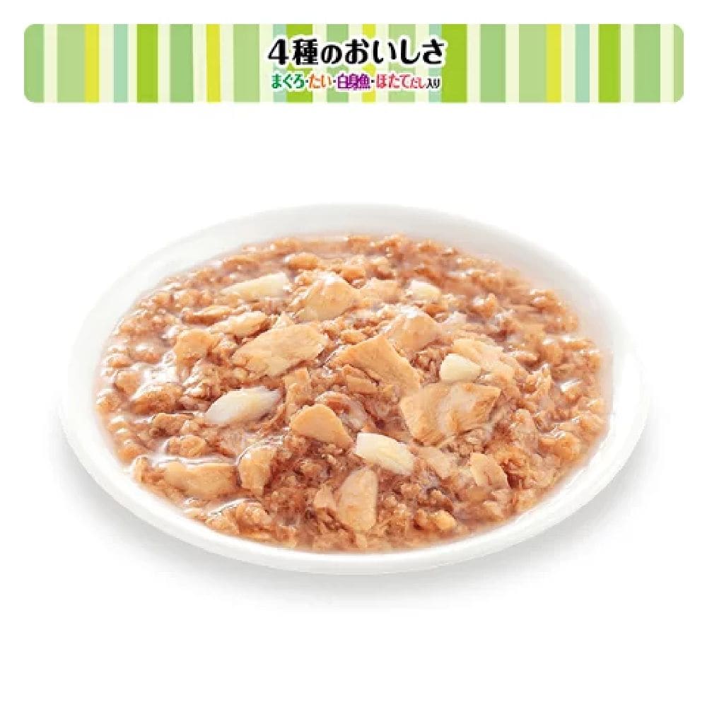 【4種のおいしさ まぐろ・たい・白身魚・ほたてだし入り】魚介類(かつお、さば、白身魚、まぐろ、ほたてエキス、たいエキス等)、肉類(チキン、ビーフ等)、植物性油脂、穀類、調味料(アミノ酸等)、ビタミン類(B1、B2、B6、B12、C、E、K、コリン、ナイアシン、パントテン酸、ビオチン、葉酸)、ミネラル類(Ca、Cl、Cu、Fe、I、K、Mg、Mn、Na、Zn)、アミノ酸類(タウリン)、増粘多糖類、ポリリン酸Na、EDTA-Na、発色剤(亜硝酸Na)【4種のおいしさ まぐろ・かつお・さけ・えび風味】魚介類(かつお、さば、さけ、まぐろエキス等)、肉類(チキン、ビーフ等)、植物性油脂、穀類、調味料(アミノ酸等)、ビタミン類(B1、B2、B6、B12、C、E、K、コリン、ナイアシン、パントテン酸、ビオチン、葉酸)、ミネラル類(Ca、Cl、Cu、Fe、I、K、Mg、Mn、Na、Zn)、アミノ酸類(タウリン)、増粘多糖類、ポリリン酸Na、EDTA-Na、えびフレーバー、発色剤(亜硝酸Na)、リコピン色素