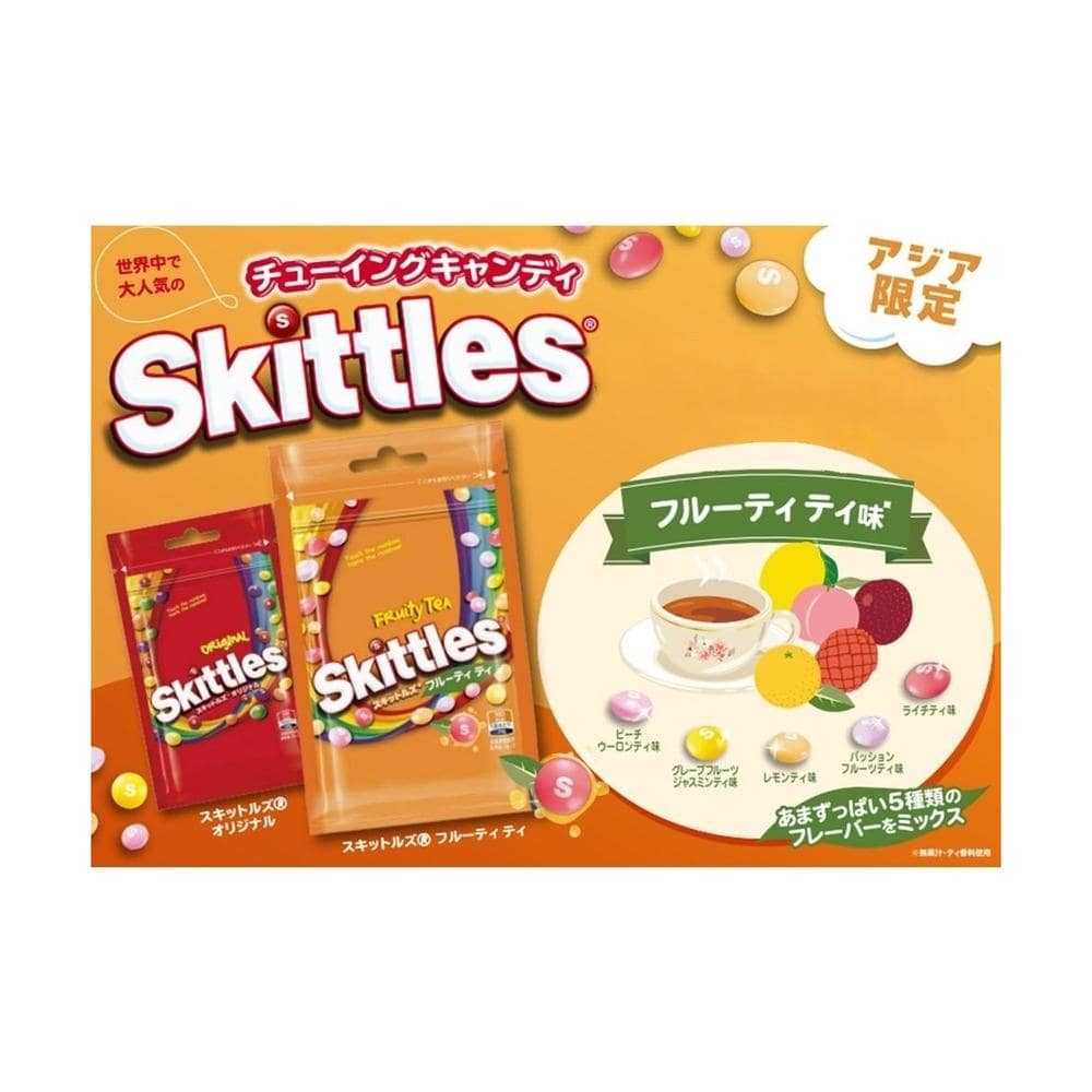 アメリカNo1のキャンディーブランド。 世界で愛されて50年!アジア限定フレーバー! 定着している「お茶」文化をSkittlesで表現。 グレープフルーツジャスミンティ、レモンティ、ピーチウーロンティ、ライチティ、パッションフルーツティ