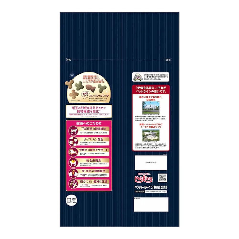 まぐろ味をベースに愛猫の大好きな味をミックス、β‐グルカン、グルコサミン、ハーブを配合。 食物繊維を配合して毛玉の形成を抑制、猫の下部尿路の健康維持に配慮してマグネシウムを調整。