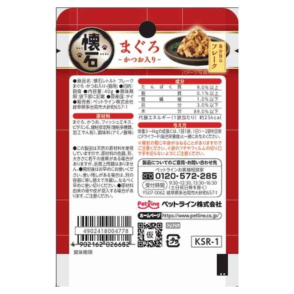 【原材料】まぐろ、かつお、フィッシュエキス、ビタミンE、増粘安定剤(増粘多糖類、加工でん粉)、調味料(アミノ酸等) 【成分】たんぱく質・・・9.0%以上、脂質・・・0.1%以上、粗繊維1.0%以下、灰分3.0%以下、水分89.0%以下、エネルギー・・・約25kcal/袋