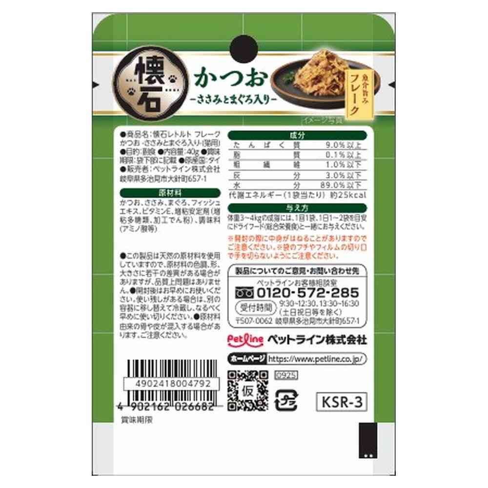 【原材料】かつお、ささみ、まぐろ、フィッシュエキス、ビタミンE、増粘安定剤(増粘多糖類、加工でん粉)、調味料(アミノ酸等) 【成分】たんぱく質・・・9.0%以上、脂質・・・0.1%以上、粗繊維1.0%以下、灰分3.0%以下、水分89.0%以下、エネルギー・・・約25kcal/袋