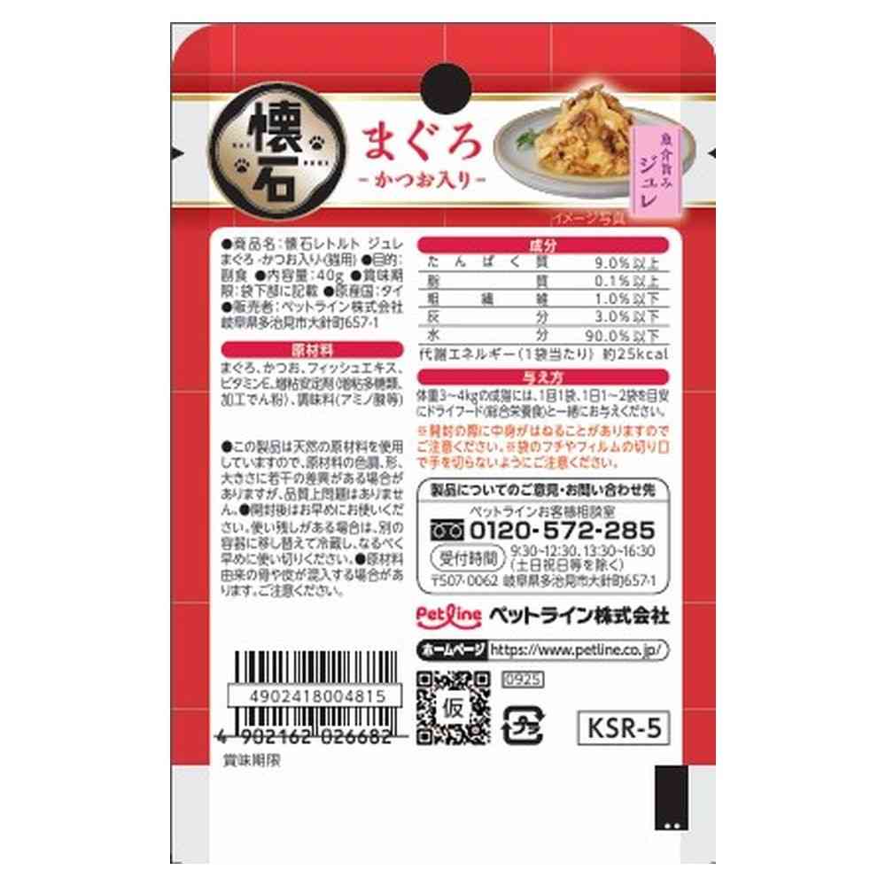 【原材料】まぐろ、かつお、フィッシュエキス、ビタミンE、増粘安定剤(増粘多糖類、加工でん粉)、調味料(アミノ酸等) 【成分】たんぱく質・・・9.0%以上、脂質・・・0.1%以上、粗繊維1.0%以下、灰分3.0%以下、水分89.0%以下、エネルギー・・・約25kcal/袋